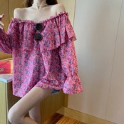 オフショルダートップス ブラウス フリル シフォン ピンク 小花柄 フラワーフロントギャザー プルオーバー 春夏秋トップス キャンディースリーブ ゆるふわ サイズ豊富 大人可愛い おしゃれ レディース 長袖トレンド シアー 透け感 可憐 綺麗め カジュアル 女の子っぽい ラフ ルーズ 韓国ファッション 韓国服 お買い得 着まわせる 低価格 プチプラ インポート 輸入服 10代 20代 S M L XL ガールズ ガーリー デート ビーチ プール リゾート 旅行 海 リラックススタイル ゆったり
