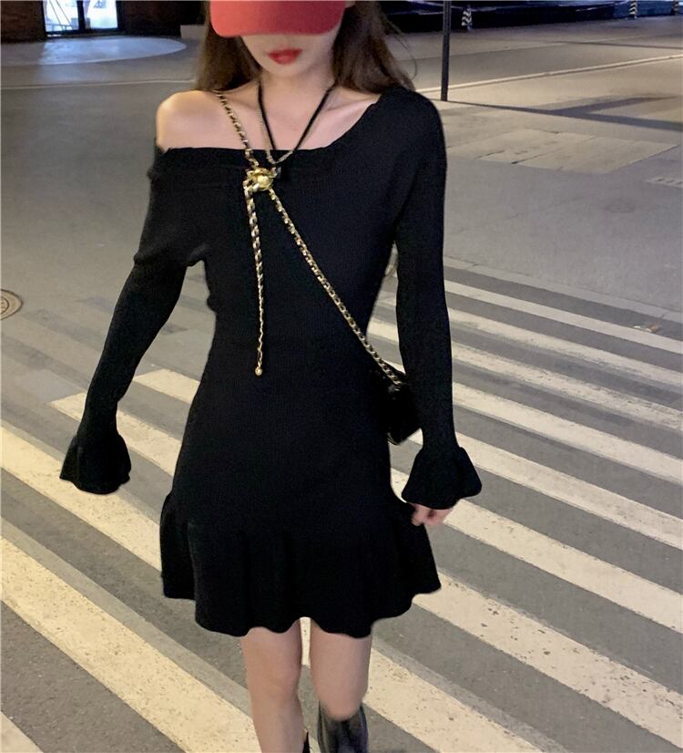 ニットワンピース ニット デコルテ見せ 袖口フリル フリル ホルダーネック ブルー ブラック ミディアム ミディ丈 プチプラ Aライン ウエスト ひざ丈 ワンピドレス スプリット きれいめ 大人可愛い 大人女子 おしゃれ こなれ感 カジュアル 普段着 普段使い オシャレ オトナモード クール スタイリッシュ 大人女子 ラクチン Aラインワンピ ガーリー ラブリー キュート10代 20代 誕生日 謝恩会 二次会 学生 お出かけ 休日 デート 記念日 女子会 イベント パーティー 旅行 モテ トレンド 海外