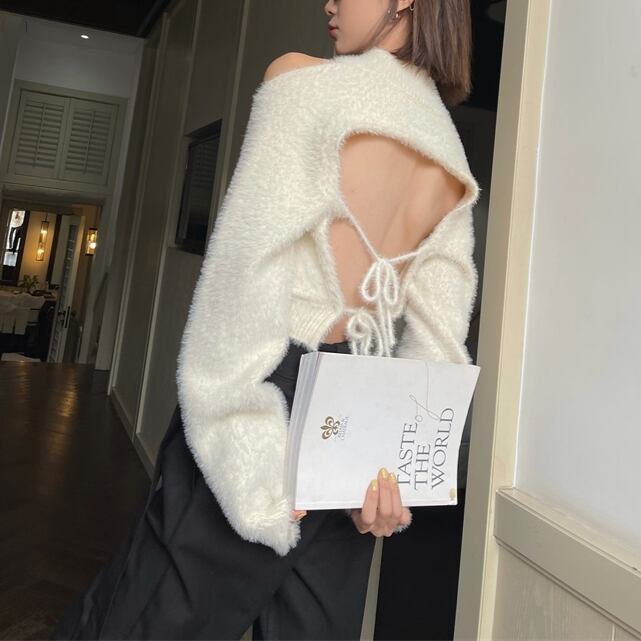 セーター 背中見せ トレンド おしゃれ 蝶々結び ふわふわ ブラック アプリコット オフショルダー デザイン重視 韓国デザイン オルチャン 海外ファッション インポートファッション 海外デザイン インポート プチプラ ランキング 大人女子 女子会 飲み会 メンズライク 暖かい スタイリッシュ 大人かっこいい カジュアル 普段着 普段使い 着回し セクシー 大人かっこいい クールセーター インスタ映え 映える 高見え 10代 20代 30代 セクシー背中 特別な日 ラクチンコーデ 個性的 個性派 素敵
