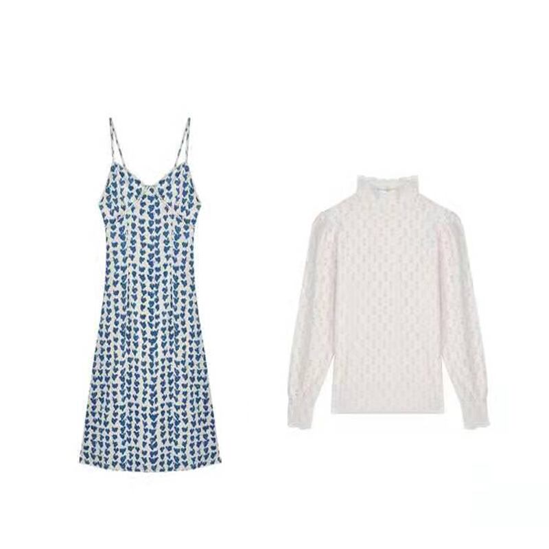 セットアップ レディース キャミワンピ スリット入り ハート柄 長袖ブラウス レース 花柄レース ハイネック 白ブラウス ミモレ丈 ロングスカート ハイウエスト 青 白 総柄 爽やか かわいい おしゃれ トレンド エンパイアライン スタイルアップ 脚長効果 大人っぽい 大人可愛い 大人女子 好感度アップ ナチュラル クラフト柄 手書き風 ツーピース ショッピング ランチ 女子会 幼稚園送迎 デート 普段使い 春秋 ピュア 清潔感 高見え お買い得 韓国ファッション 韓国服 インポート 低価格 プチプラ