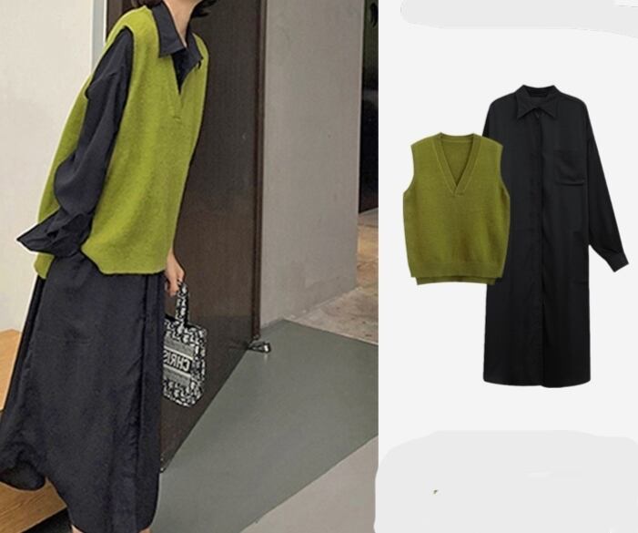 ワンピース ベスト レディース 女性用 胸ポケット ドレス セット 長袖 ロング丈 ポロ 前ボタン ニット セーター 襟あり Vネック シャツ バルーン袖 フレア袖 大人可愛い カジュアル 大人カジュアル かわいい ガーリー おしゃれ かっこいい 大人女子 メンズライク レディライク 単色 黒 ブラック 深緑 緑 グリーン カーキ お出かけ デート 秋 冬 春 韓国ファッション トレンド OL 通勤 通学 学生 10代 20代 30代 人気 ラフ こなれ感