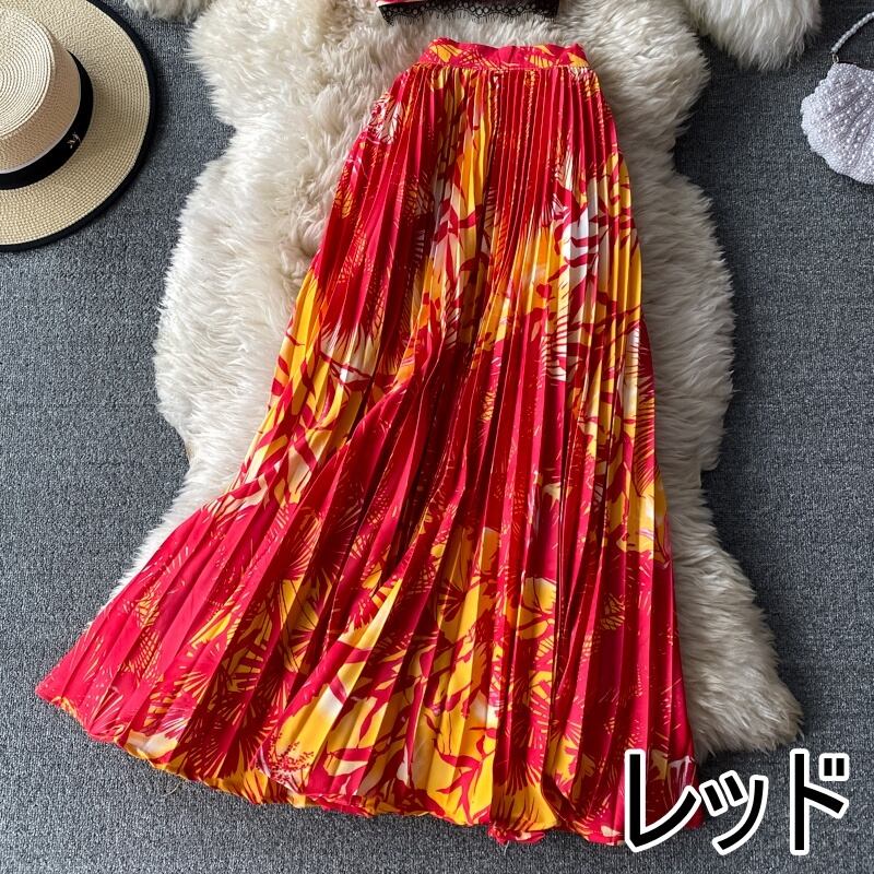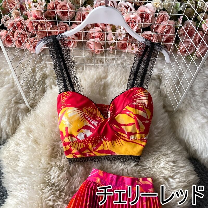 セットアップ カラフル ビビットカラー ホットアイテム 海外デザイン インポートファッション インスタ映え 映える 大人かっこいい 行動派 ダンス 衣装 お気に入り キャミソール へそ出し ロングスカート プリーツスカート レース 上下セット 2点セット カジュアル おしゃれ インポート かっこいい エキゾチック 個性的 個性派 クール セクシー 華やか 主役級 存在感 ゴージャス ボタニカル リーフ柄 10代 20代 30代 お出かけ イベント リゾート ビーチ 旅行 海 脚長 インスタ映え