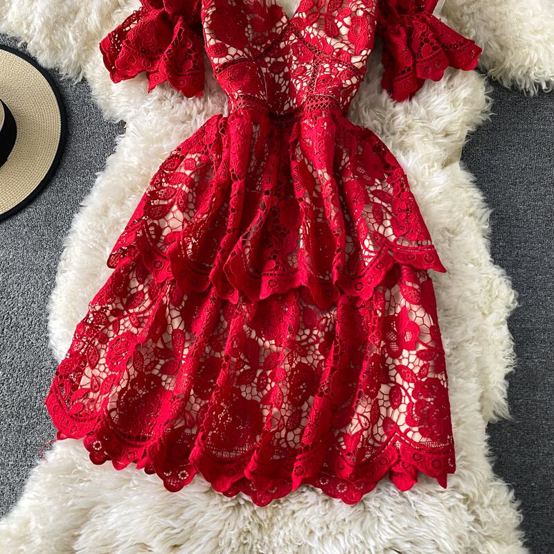 ワンピース ワンピドレス ショート丈 レッド 赤 花柄 総レース ゴージャス フリル袖口 フリル 花柄レース 大人可愛い ウエディング 二次会 発表会 衣装 裏地あり 2段レース 半袖 パフスリーブ Vネック 胸元 レース フリル ウエストマーク ファスナー 透け感 かわいい お洒落 インポート 海外 大人可愛い ラブリー キュート ガーリー 個性的 エレガント 華やか セクシー 主役級 存在感 春 夏 10代 20代 30代 デート お出かけ 女子会 パーティー クラブ イベント モテ インスタ映え