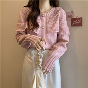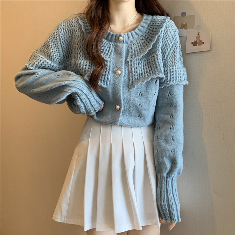 ワッフル編み カーデガン ニット セーター長袖 ブルー アプリコット ピンク ブラウン もこもこ ホットアイテム ロングスリーブ 暖かい おしゃれ着 オシャレカーデガン フリル かわいい カジュアル お出かけ ストリート 重ね着 着回し ファッションセンス レディースアイテム 人気商品 大人可愛い きれいめ 飾りボタン 海外デザイン インポートファッション オルチャン おススメ 韓国風 レトロスタイル ぬくぬく お出かけ着 買い物 旅行 フロントボタン ゆるかわ リラックス 乙女 袖長め ワンサイズ