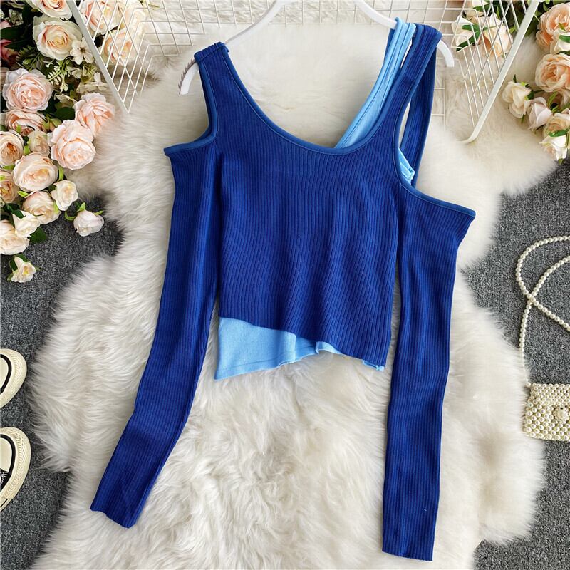 トップス タンクトップ フェイク デザイン重視 アンサンブル オープンショルダー 袖あり 長袖 襟なし ドッキング ツートンカラー 黒 ブラック 青 ブルー かわいい 大人可愛い 大人 大人女子 きれいめ おしゃれ お洒落 シンプル ラブリー キュート ガーリー フェミニン 10代 20代 学生 通学 デート お出かけ 女子会 休日 マニッシュ スポーティー 運動 ジム 普段使い カジュアル スリム タイト こなれ感 ルーズ インスタ映え 重ね着 抜け感 個性的 存在感 セクシー 夏 パーティー イベント
