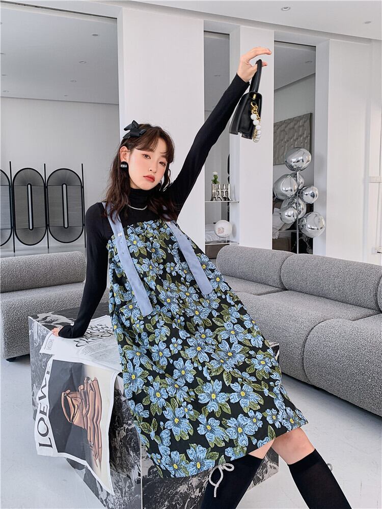 ワンピース レディース 女性用 ドレス ひざ下 ロング丈 ストラップスカート スカート ボタン ポケット Aライン ストラップ ゴム 調節 大人可愛い カジュアル 大人カジュアル かわいい ガーリー おしゃれ かっこいい 大人女子 レトロ 洋風 シック メンズライク レディライク フラワー 花柄 ボタニカル柄 刺繡 ハート 黒 ブラック 青 ブルー 水色 フリーサイズ お出かけ デート 秋 春 韓国ファッション トレンド OL 通勤 通学 学生 10代 20代 30代 人気 個性的 こなれ感 スタイル