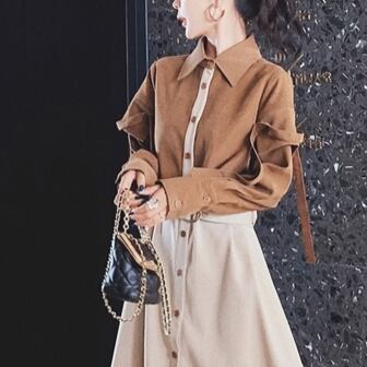 ミルクティーブラウン フェイクツーピースドレス 新作 デザインコントラスト カラーシャツ ロングスカートワンピース フレアワンピース Aラインワンピース 長袖 無地 フレア かわいい 大人可愛い きれいめ シンプル カジュアル 大人 上品 おしゃれ お洒落 大人可愛い 大人女子 個性的 存在感 とろみ感 ミモレ M L XL 2XL 3XL 4XL 20代 30代 デート お出かけ 女子会 休日 着回し 普段使い 韓国 韓国系 オルチャン コーデ スタイル 楽ちん モテ プチプラ トレンド インスタ映え