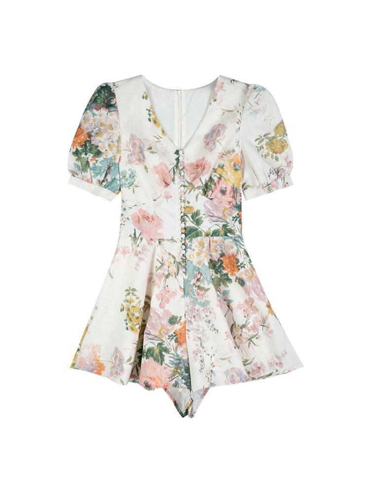 ワンピース オールインワン フラワーデザイン キュロット ショート ショート丈 半袖 Vネック ファスナー ボタン フレア ハイウエスト ウエストマーク かわいい 大人可愛い きれいめ 大人 上品 おしゃれ お洒落 大人女子 ラブリー キュート ガーリー エレガント 主役級 S M L XL 白 ホワイト 花柄 フラワー 春 夏 10代 20代 30代 学生 デート お出かけ 女子会 パーティー リゾート 旅行 海 韓国 スタイル オルチャン ファッション モテ プチプラ トレンド 流行