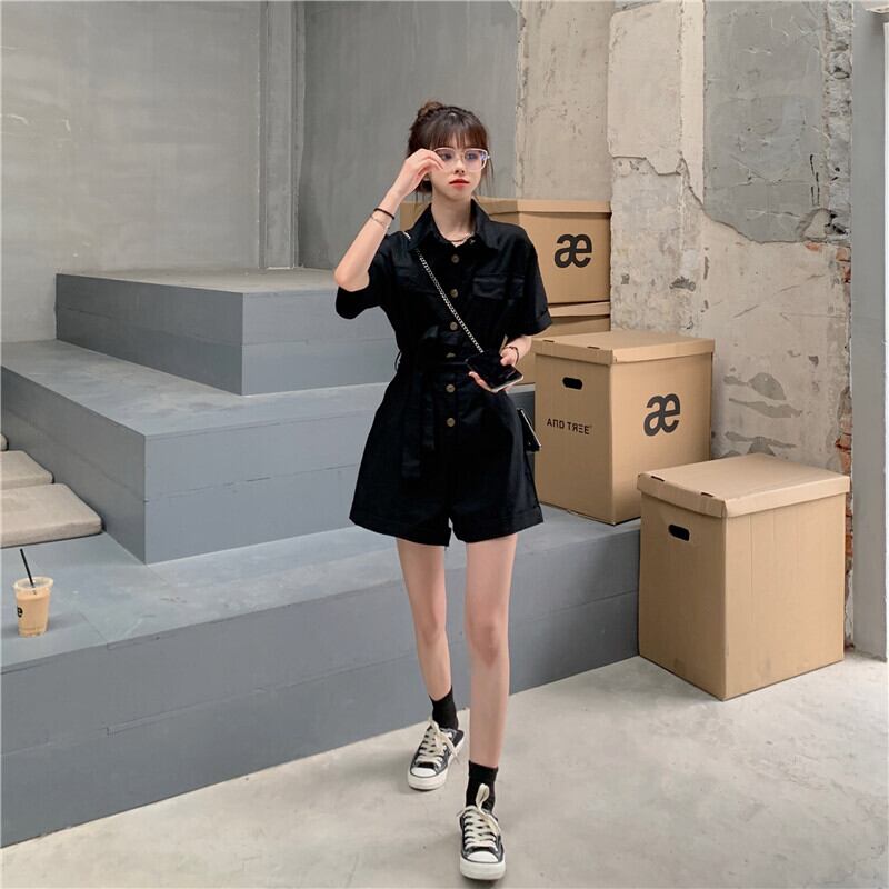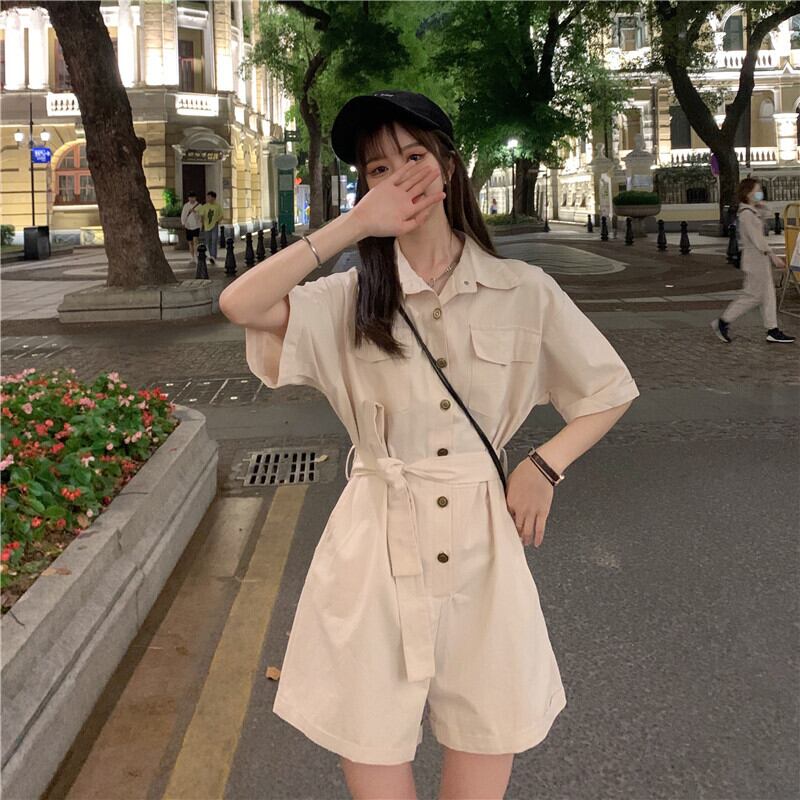 オールインワン トップス ボトムス パンツ ズボン レディース 女性用 半袖 ボーイッシュ ミニ丈ショート丈 胸ポケット ベルト 襟あり ポロシャツ ワイドパンツ 前ボタン 大人可愛い カジュアル 大人カジュアル かわいい ガーリー おしゃれ かっこいい 大人女子 レトロ シック クール メンズライク レディライク フリーサイズ 単色 青 ブルー ベージュ 黒 ブラック 夏 お出かけ デート 韓国ファッション トレンド OL 通勤 通学 学生 10代 20代 30代 人気 シンプル ラフ こなれ感
