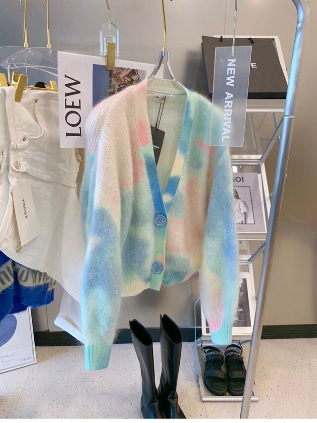 カーディガン 七色 レインボーカラー 綿菓子 ふわふわ 虹色 インポートファッション 海外デザイン スタイリッシュ フェミニン ショート丈 絞り染め 長袖 Vネック シングルブレスト 大人女子 大人 上品 おしゃれ デイリーウェア レトロ レトロ風 ルーズ ラフ キュート かわいい 女子 個性的 デザイン 主役級 存在感 柄 配色 秋 オータム 20代 10代 レディース 女性用 オフィス ビジネス OL 通勤 学生 学校 通学 着回し 普段使い 重ね着 レイヤード トレンド 暖かい 防寒 S M L