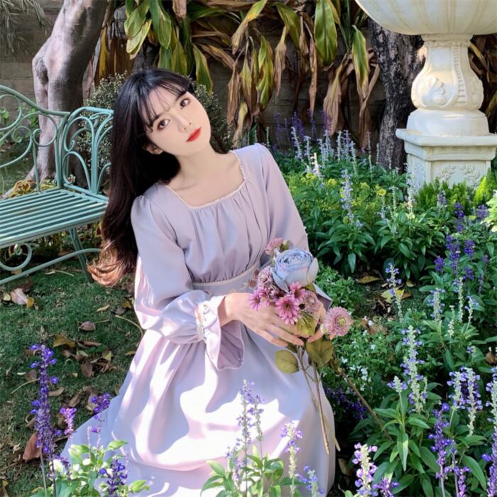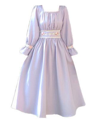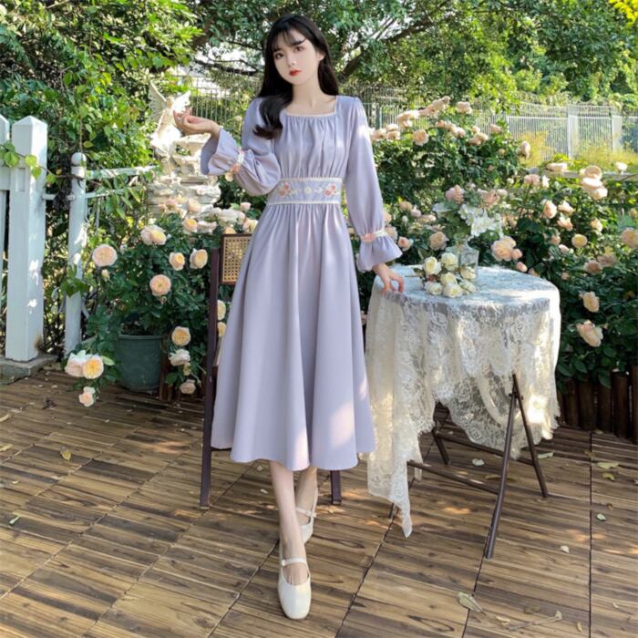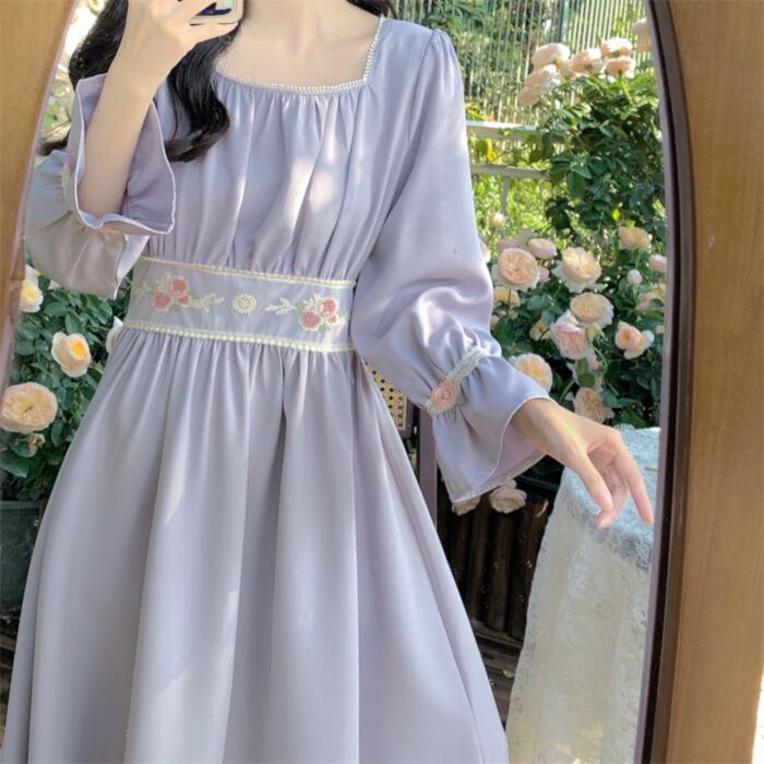 ワンピース ロングスカート フレアスカート フレアーワンピース 袖あり 長袖 ベルシェイプカフス スクエアネック ウエストマーク 刺繍 薄紫 ライトパープル パステルカラー レトロ かわいい 大人可愛い 大人 大人女子 きれいめ おしゃれ お洒落 シンプル ラブリー キュート ガーリー フェミニン 10代 20代 30代 通勤 学生 通学 デート お出かけ 女子会 休日 普段使い カジュアル こなれ感 抜け感 ラフ ゆる インスタ映え 上品 エレガント 可憐 華やか 二次会 披露宴 パーティー イベント