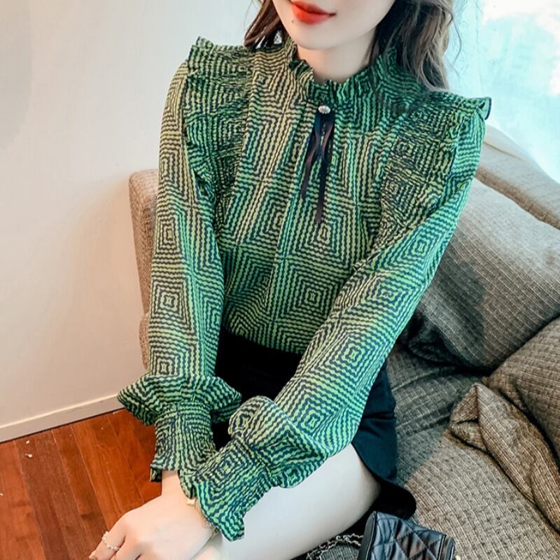 トップス ブラウス レトロデザイン 今風 プルオーバー 長袖 ボリューム袖 スタンドカラー シフォンブラウス ボウタイ フリル かわいい フェミニン 大人可愛い 大人女子 おしゃれ レトロ エレガント クール 個性派 ガーリー 存在感 海外 インポート 緑 グリーン 茶色 ブラウン 柄 プリント スクエア S M L XL 2XL 3XL 10代 20代 30代 入園式 卒業式 謝恩会 二次会 レストラン 通勤 OL オフィス 学生 デート お出かけ 休日 女子会 着回し 普段使い おすすめ
