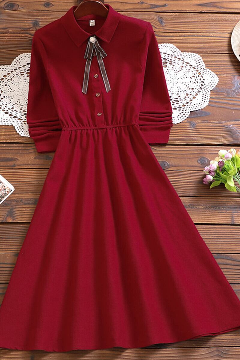 ワンピース レディース ひざ丈 膝丈 ミモレ丈 ミディアム丈 袖あり 長袖 襟付き ボウタイ ボタン フレアスカート Aライン リボン 外国風 かわいい 大人可愛い きれいめ シンプル 上品 おしゃれ お洒落レトロ フェミニン ラブリー キュート ガーリー S M L XL 赤 レッド ベージュ 秋カラー 無地 春 秋 冬 10代 20代 30代 OL 学生 デート お出かけ 女子会 パーティー イベント 二次会 謝恩会 旅行 インポート 海外 モテ プチプラ 定番