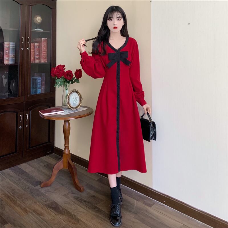 ワンピース レディース ひざ丈 ミモレ ミモレ丈 ロング ロング丈 袖あり 長袖 ボリューム袖 Vネック セミフレア リボン 前開き Aライン 可愛い 大人可愛い きれいめ シンプル 大人 上品 おしゃれ お洒落 かわいい レトロ 大人女子 ラブリー キュート ガーリー 主役級 存在感 M L XL 2XL 3XL 4XL 黒 ブラック 赤 レッド バイカラー 無地 春 秋 誕生日 入学式 入園式 卒業式 卒園式 10代 20代 30代 オフィス ビジネス OL 通勤 学生 通学 デート 旅行