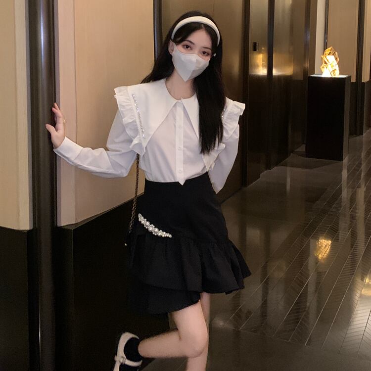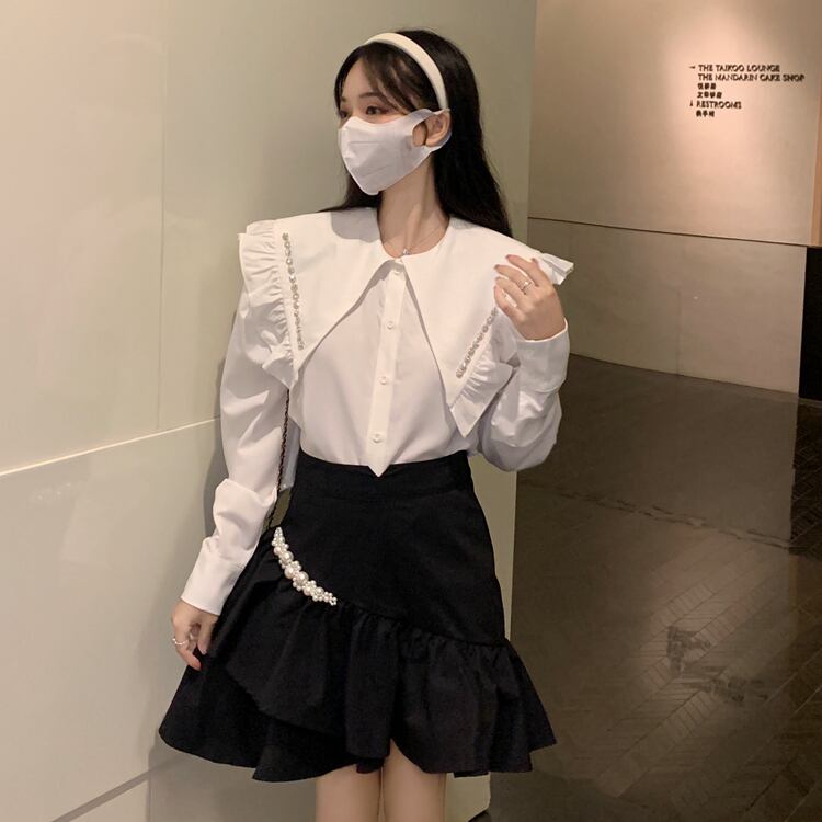 トップス ブラウス 白シャツ 袖あり 長袖 襟付き ビッグカラー インポートデザイン ボタンダウン 前開き 白 ホワイト ラインストーン キラキラ きらきら かわいい 大人可愛い 大人 大人女子 きれいめ おしゃれ お洒落 シンプル ラブリー キュート ガーリー フェミニン 10代 20代 30代 通勤 学生 通学 デート お出かけ 女子会 休日 普段使い カジュアル こなれ感 抜け感 ゆったり ゆる 楽ちん 上品 エレガント 優雅 華やか インパクト 二次会 披露宴 パーティー イベント 着回し