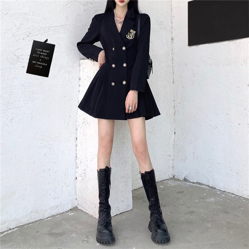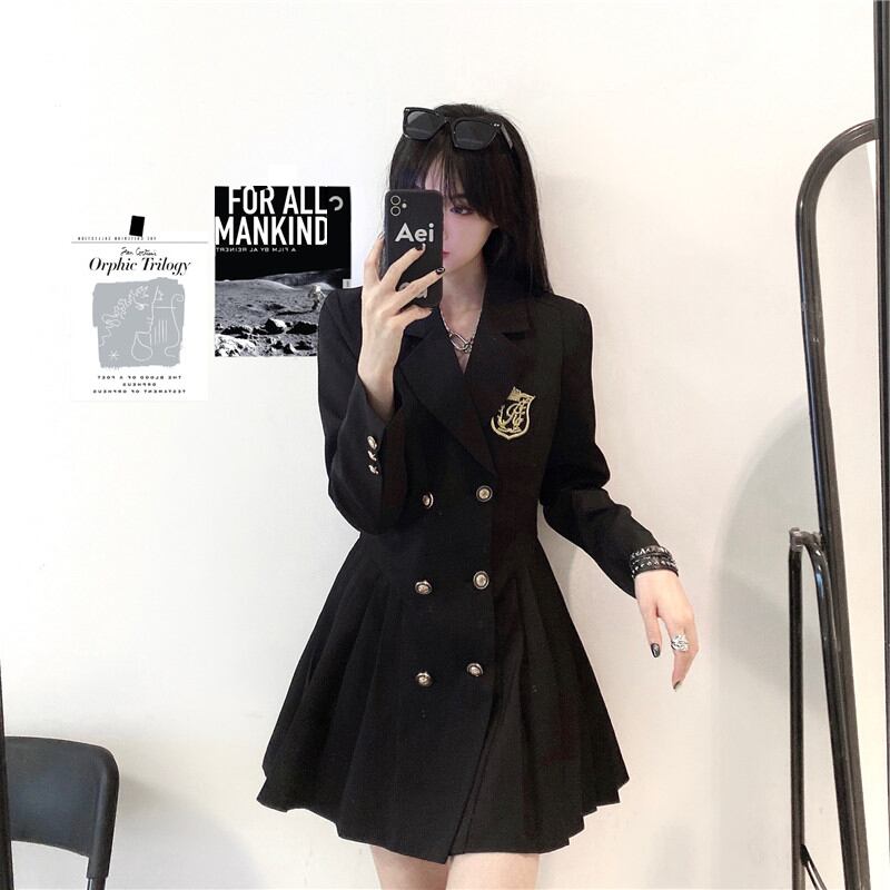 ワンピース ミニ丈 ショート丈 プリーツスカート 黒 ブラック 袖あり 長袖 襟付き ノッチドラペルカラー スーツカラー スリム タイト 細身 Aライン ボタン ボタンダウン ダブルボタン 金ボタン キッシングボタン 前開き ハイウエスト 厚手 かわいい 大人可愛い きれいめ シンプル レトロ 上品 おしゃれ かっこいい インポートデザイン 大人女子 ラブリー ガーリー キュート クール デート 学生 通学 デート お出かけ 女子会 休日 パーティー イベント 披露宴 二次会 結婚式 誕生日 フォーマル
