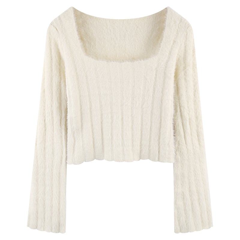 トップス ニット セーター ショート丈 白 ホワイト パープル 紫 パフスリーブ ゆるかわ 海外デザイン 長袖 スリム タイト ストレート 人気 伸縮性 かわいい 大人可愛い きれいめ シンプル カジュアル 大人 上品 おしゃれ お洒落 大人女子 こなれ感 個性的 とろみ感 スクエアネック ショート くすみカラー ワンサイズ 20代 30代 学生 通学 デート お出かけ 女子会 休日 着回し 普段使い 韓国 韓国系 オルチャン ファッション スタイル 楽ちん モテ プチプラ トレンド 流行 インスタ映え