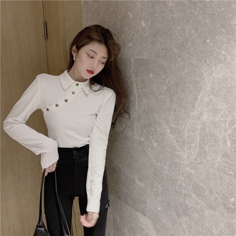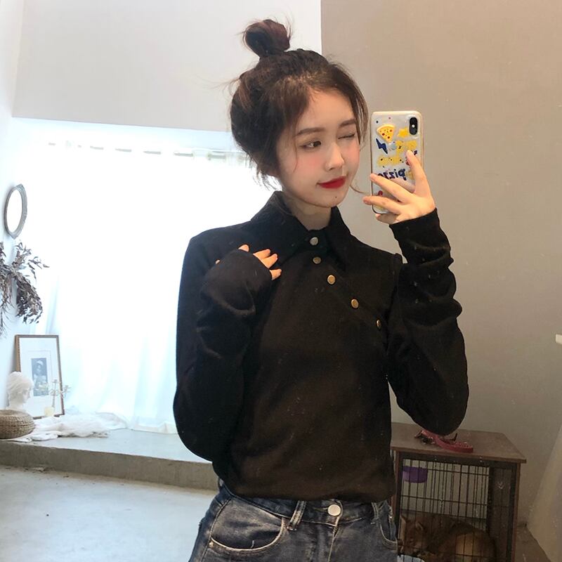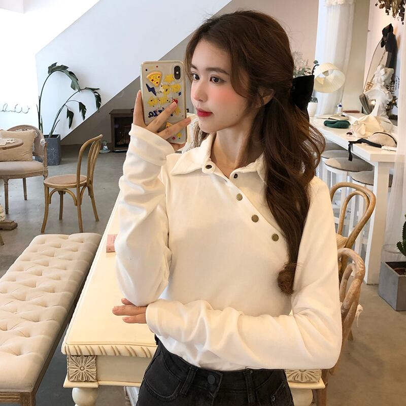 トップス レディース 肩開き 女性用 長袖 厚め トレーナー 襟あり ポロ シャツ ボタン 斜めボタン 左右非対称 レトロ シック 大人可愛い カジュアル 大人カジュアル かわいい ガーリー おしゃれ かっこいい 大人女子 メンズライク レディライク 平均 フリーサイズ ワンサイズ モノトーン 単色 黒 ブラック 白 ホワイト 秋 冬 春 お出かけ デート 韓国ファッション トレンド OL 通勤 通学 学生 10代 20代 30代 個性的 人気 シンプル ラフ こなれ感 ゆったり 暖かい スリム タイト