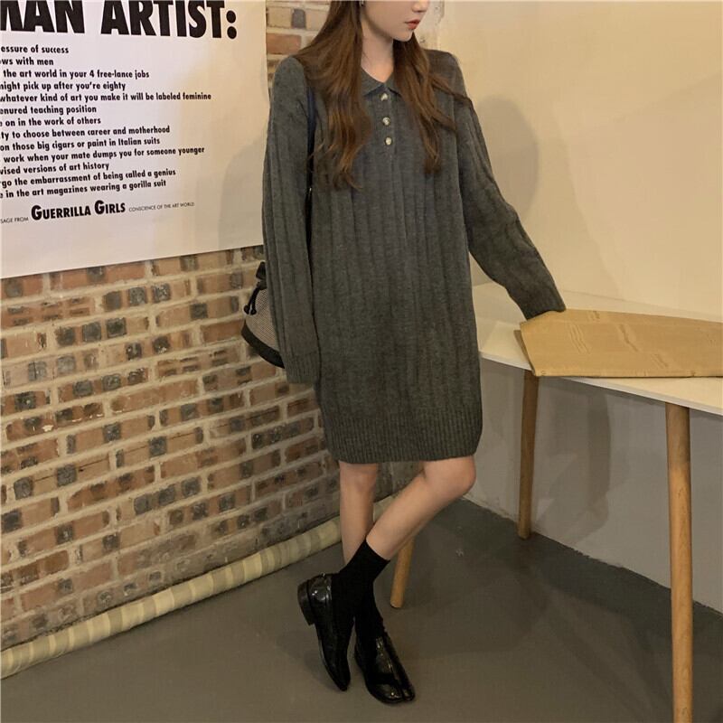 ワンピース レディース 女性用 長袖 ドレス スカート 膝上 厚め ニット セーター 襟あり ポロ ボタン レトロ シック 大人可愛い カジュアル 大人カジュアル かわいい ガーリー おしゃれ かっこいい 大人女子 メンズライク レディライク 平均 フリーサイズ ワンサイズ 二色 単色 茶 ブラウン コーヒー 灰 グレー 秋 冬 お出かけ デート 韓国ファッション トレンド OL 通勤 通学 学生 10代 20代 30代 縦 個性的 人気 シンプル ラフ こなれ感 大きめ ゆったり 暖かい オーバーサイズ