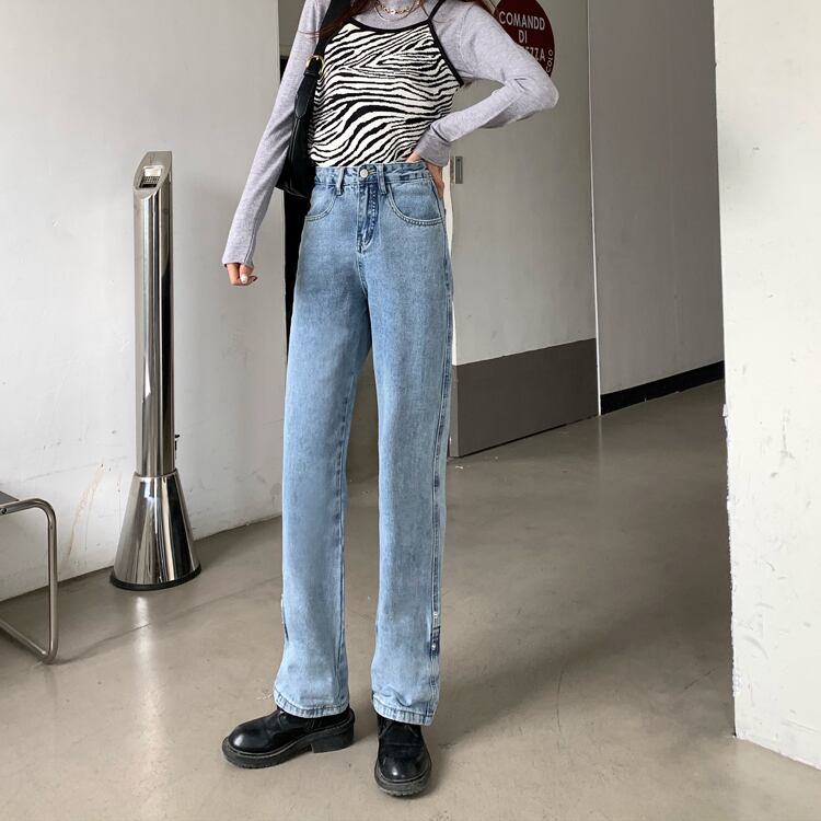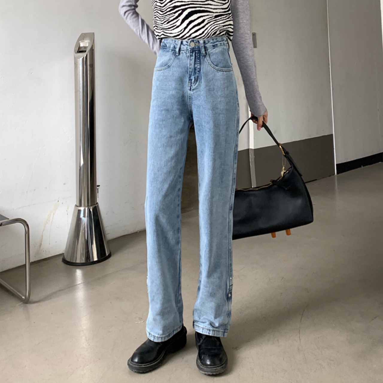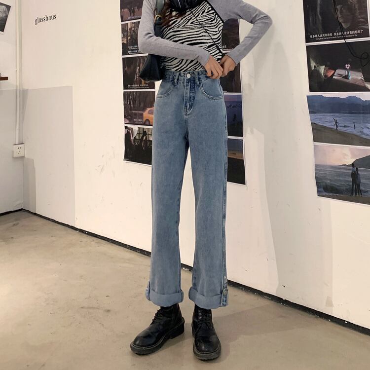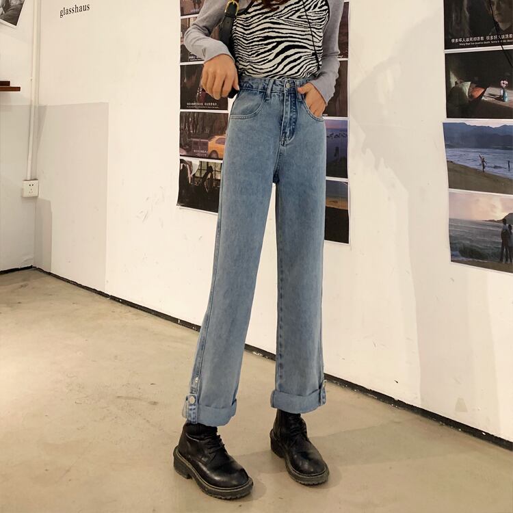 ボトムス パンツ ズボン レディース 女性用 長め ボタン ハイウエスト ワイドフット ジッパー ロールアップ ワイドレッグ ストレート ジーンズ デニム ルーズ レトロ シック 大人可愛い カジュアル 大人カジュアル かわいい ガーリー おしゃれ かっこいい 大人女子 メンズライク レディライク 単色 青 ブルー ライトブルー 秋 冬 春 お出かけ デート 韓国ファッション トレンド OL 通勤 通学 学生 10代 20代 30代 個性的 人気 シンプル ラフ こなれ感 大きめ ゆったり 明るめ