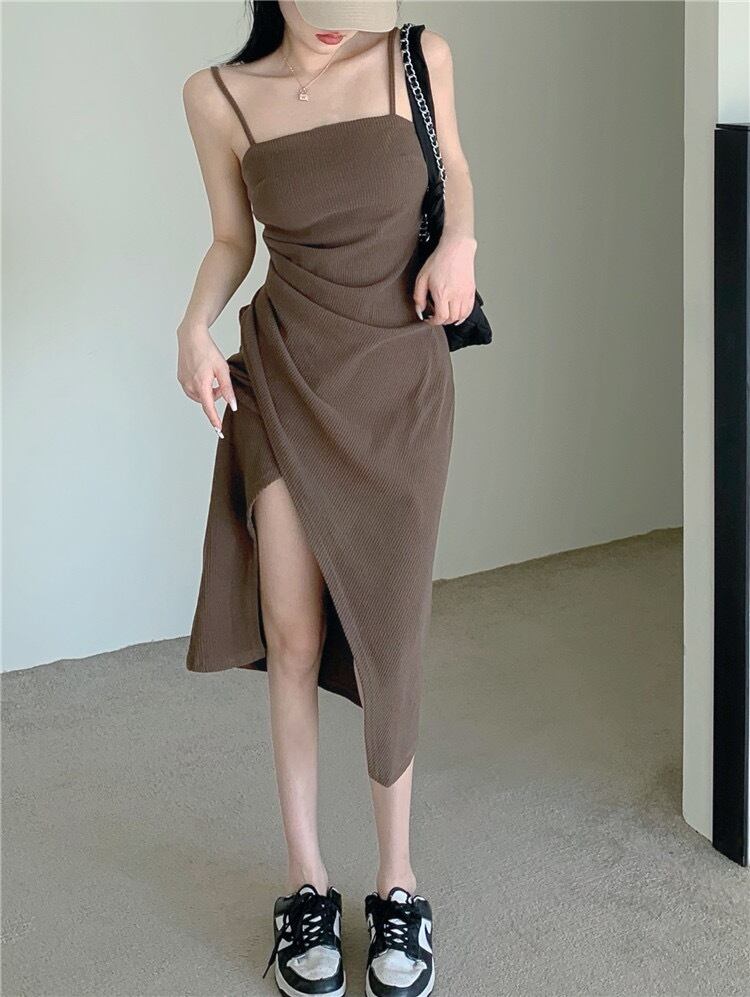 ワンピース レディース ミドル丈 ミドル丈スカート スリット サスペンダー ハイウエスト バックレス プルオーバー Aラインスカート Aライン ノースリーブ ナイロン ブラウン ブラック 黒 袖なし 春 レトロ ストレート スリム スリムフィット 細身 無地 シンプル かわいい フェミニン 大人可愛い セクシー 大人女子 おしゃれ クール 個性派 ガーリー 存在感 海外 インポート 20代 30代 40代 パーティー パーティードレス イベント お出かけ 結婚式 披露宴 二次会 謝恩会 韓国ファッション