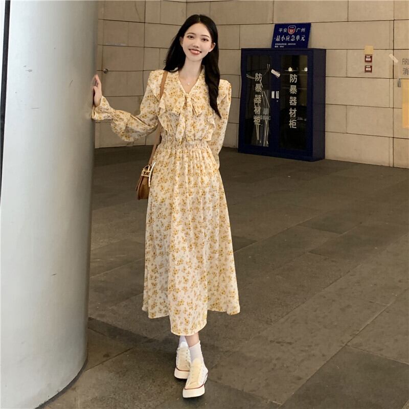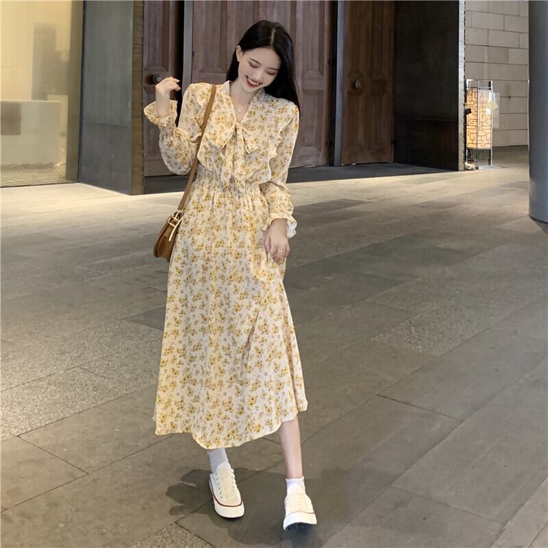 ワンピース レディース フレアスカート ロングスカート ロング丈 袖あり 長袖 ベルスリーブ Vネック リボンタイ ギャザー フレア アプリコット 白 黒 ブラック かわいい 大人可愛い 大人 大人女子 きれいめ おしゃれ お洒落 ラブリー キュート ガーリー フェミニン 10代 20代 30代 通勤 学生 通学 デート お出かけ 女子会 休日 普段使い カジュアル こなれ感 抜け感 ラフ ルーズ ゆったり ゆる フローラル 花柄 小花柄 フラワー ボタニカル モテ 上品 エレガント 優雅 可憐 華やか