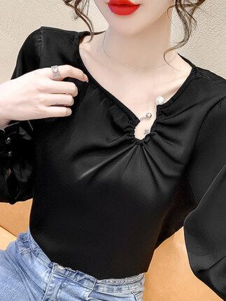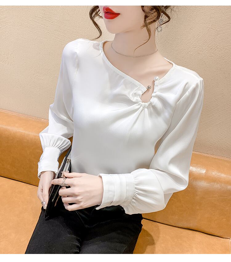 胸元のパールがアクセントのブラウス。