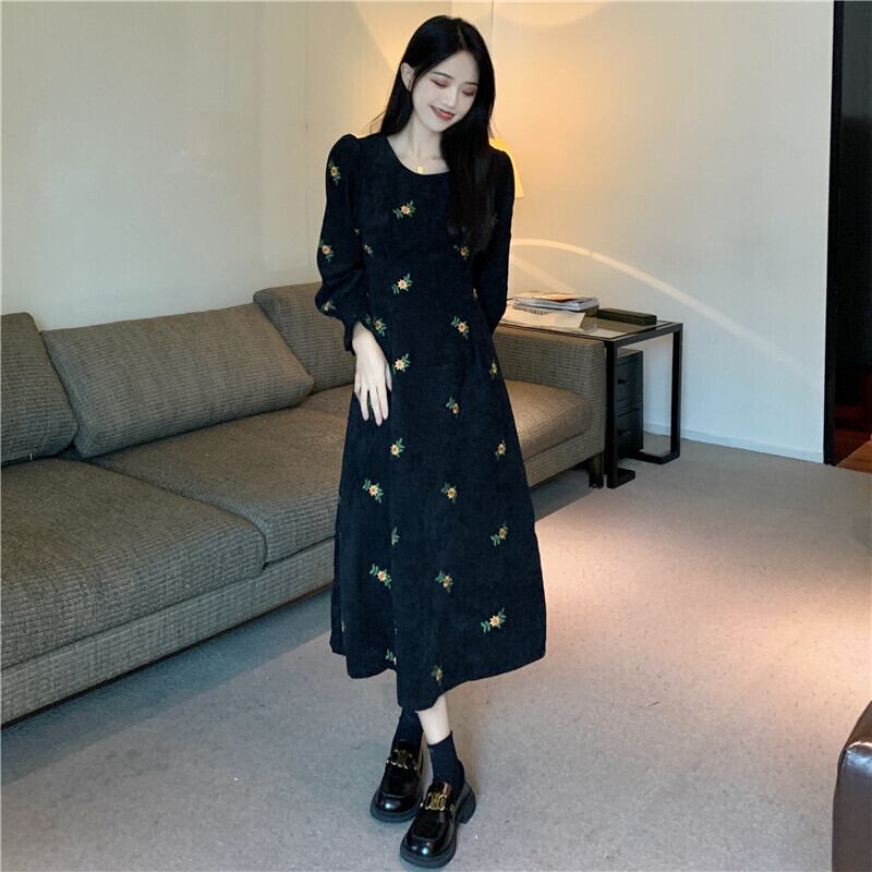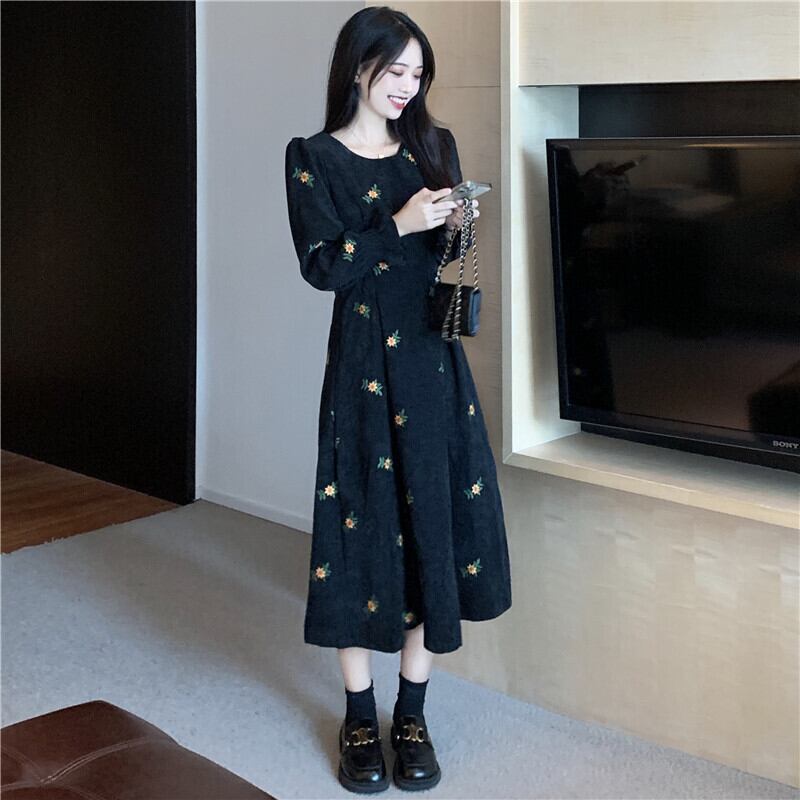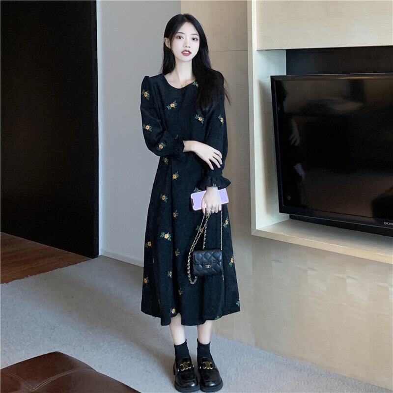 ワンピース レディース ロングスカート フレアスカート ロング丈 袖あり 長袖 ベルシェイプカフス 襟なし ラウンドネック 刺繍 タック アプリコット 白 黒 ブラック 厚手 かわいい 大人可愛い 大人 大人女子 きれいめ おしゃれ お洒落 シンプル ラブリー キュート ガーリー フェミニン 10代 20代 30代 通勤 学生 通学 デート お出かけ 女子会 休日 普段使い カジュアル こなれ感 抜け感 ゆったり ゆる フローラル 花柄 小花柄 フラワー ボタニカル 上品 エレガント シック パーティー