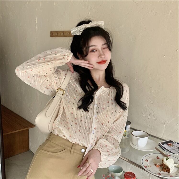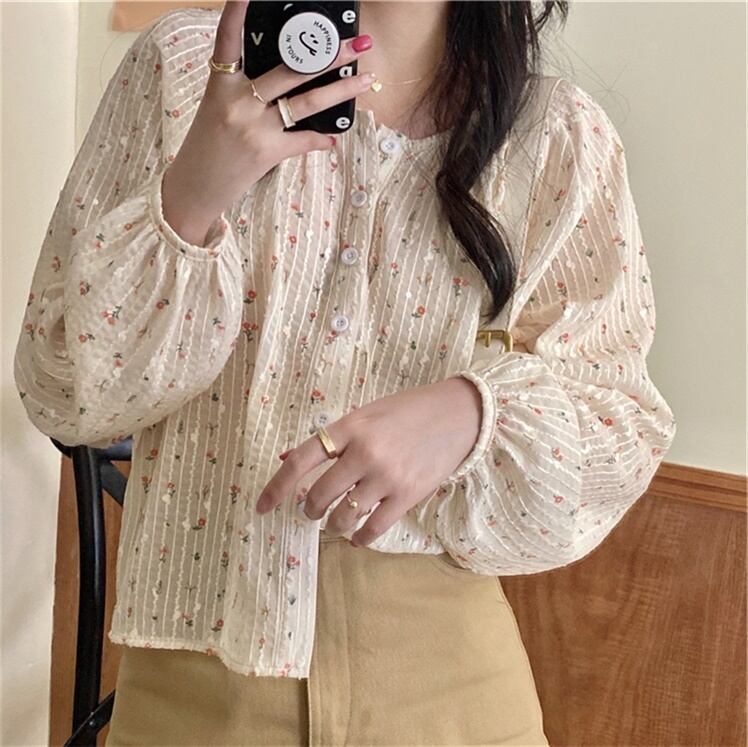 トップス レディース シャツ 長袖 袖あり 襟なし 薄手 ラウンドネック ボタン 前開き 花柄 フラワー フローラル 柄 春 レトロ ゆったり かわいい フェミニン 大人可愛い セクシー 大人女子 おしゃれ クール 個性派 ガーリー ラブリー 存在感 海外 インポート アプリコット ワンサイズ 10代 20代 学生 通学 OL 通勤 デート モテ イベント お出かけ デート 女子会 韓国ファッション 人気 トレンド ゆるふわ 韓国コーデ 簡単コーデ オルチャン こなれ感 メンズライク コーデ スタイル