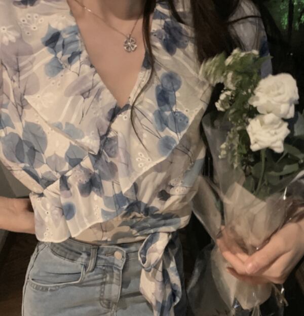 トップス レディース ブラウス 水墨画風 フローラル 花柄 フラワー ボタニカル 長袖 パイピングカフス サッシュブラウス Vネック フリル シフォン リボン 薄手 春 ひらひら 透け感 シースルー かわいい 大人可愛い 大人 大人女子 きれいめ おしゃれ お洒落 ラブリー キュート ガーリー フェミニン 10代 20代 30代 通勤 学生 通学 デート お出かけ 女子会 休日 普段使い カジュアル こなれ感 抜け感 ラフ ルーズ ゆったり ゆる 上品 エレガント 優雅 可憐 華やか 披露宴 パーティー