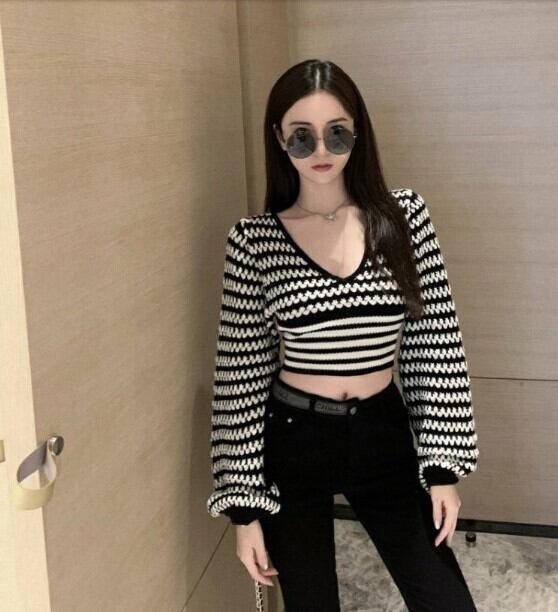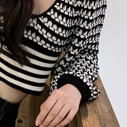 トップス レディース ニット セーター 袖あり 長袖 ボリューム袖 モノグラム へそ出し Vネック 黒 ブラック 白 ホワイト モノトーン ボーダー 縞 かわいい 大人可愛い 大人 大人女子 きれいめ おしゃれ お洒落 シンプル ラブリー キュート ガーリー フェミニン 10代 20代 学生 通学 デート お出かけ 女子会 休日 普段使い カジュアル 着回し インスタ映え モテ こなれ感 抜け感 存在感 個性的 スリム タイト 細身 ラフ ルーズ ゆる セクシー インパクト パーティー イベント