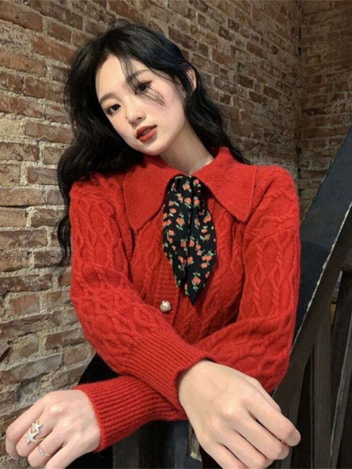 トップス レディース セーター カーディガン 赤 レッド 長袖 スカーフ付き ポエッツカラー スカーフ ボタン ボタンダウン かわいい 大人可愛い 大人 大人女子 きれいめ おしゃれ お洒落 シンプル ラブリー キュート ガーリー フェミニン 10代 20代 30代 通勤 学生 通学 デート お出かけ 女子会 休日 普段使い カジュアル こなれ感 抜け感 個性的 インスタ映え モテ ラフ ルーズ ゆったり ゆる 着回し 防寒 暖かい あったか 上品 エレガント 優雅 インパクト パーティー イベント