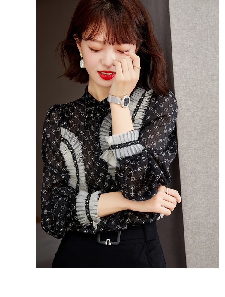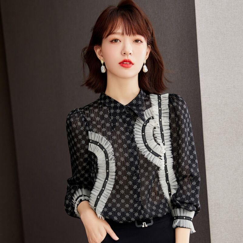 トップス レディース ブラウス 袖あり 長袖 ボリューム袖 パフスリーブ 襟付き シフォン フリル 可愛い 大人可愛い きれいめ 大人 上品 おしゃれ お洒落 かわいい フェミニン 大人女子 こなれ感 個性的 クール 華やか 存在感 抜け感 エレガント モダン 主役級 S M L XL 2XL 黒 ブラック プリント 柄 春 夏 10代 20代 30代 40代 オフィス ビジネス OL 通勤 学生 通学 デート お出かけ 女子会 旅行 着回し 普段使い 韓国 ファッション インポート