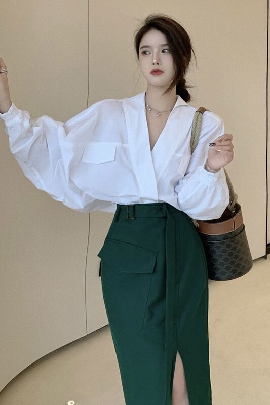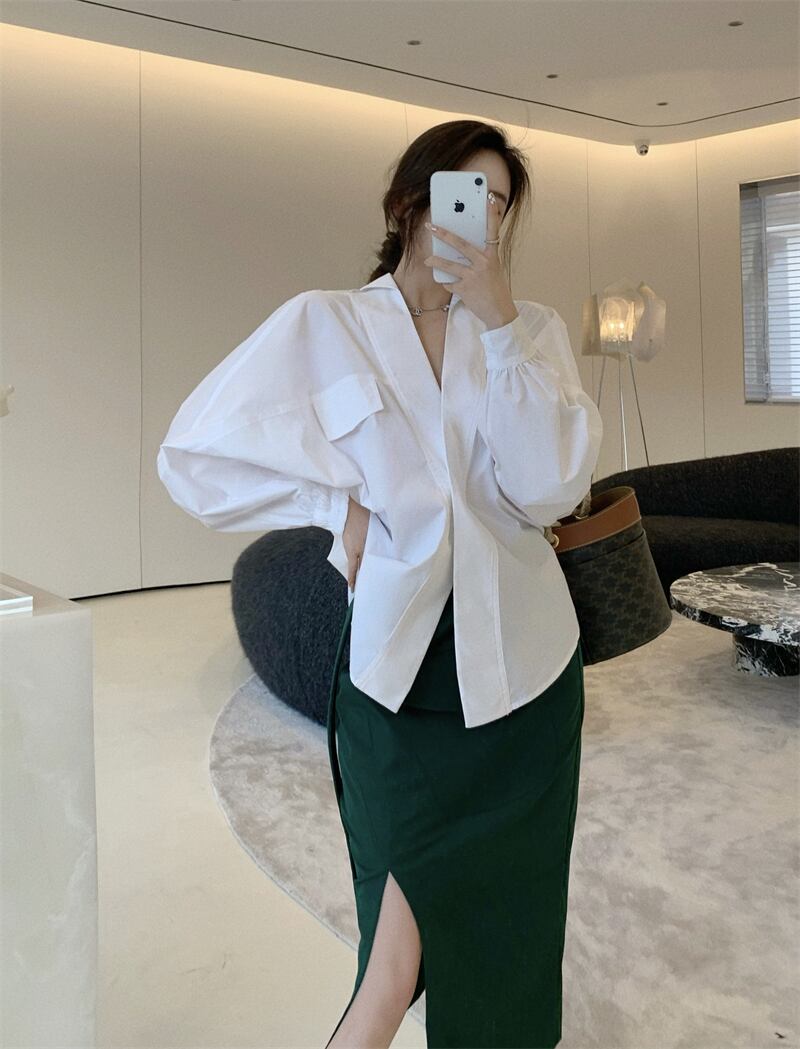 トップス レディース シャツ 白シャツ ブラウス 袖あり 長袖 ボリューム袖 Vネック 襟付き 前開き 大人可愛い シンプル カジュアル 大人 おしゃれ お洒落 大人女子 こなれ感 ラフ メンズライク マニッシュ ボーイッシュ ルーズ 個性的 クール 存在感 抜け感 エレガント モダン 主役級 S M L 白 ホワイト 無地 春 夏 秋 冬 オールシーズン シーズンレス 10代 20代 30代 ママ オフィス ビジネス OL 通勤 学生 通学 デート お出かけ 女子会 休日 着回し 普段使い インポート