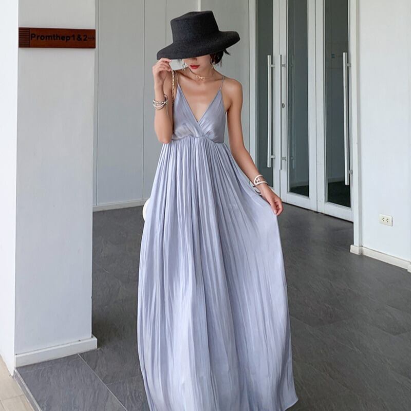 ワンピース レディース リゾートワンピース 新作 海外ファッション キャミワンピ マキシ マキシ丈 Vネック Aライン 光沢感 背中あき 可愛い 大人可愛い きれいめ シンプル カジュアル 大人 上品 おしゃれ お洒落 かわいい フェミニン 大人女子 こなれ感 ラフ ラブリー ルーズ 存在感 とろみ感 エレガント 主役級 S M L ゆったり ゆる 青 ブルー 無地 夏 10代 20代 30代 マタニティ デート リゾート 旅行 海 プール 体系カバー トレンド インスタ映え 海外 インポート 楽ちん
