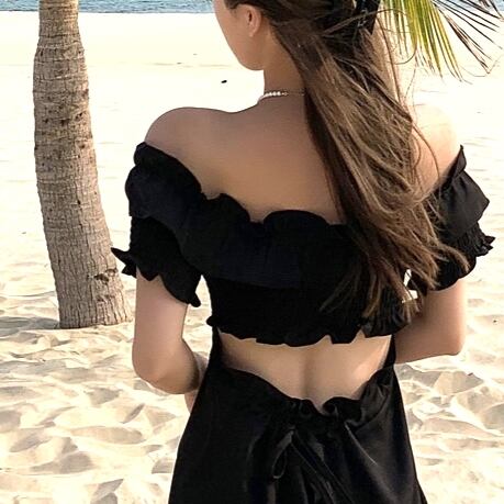 ワンピース レディース ドレス ロングスカート ロング丈 オープンバック オフショルダー デコルテ フリル バックコンシャス バックシャン 黒 ブラック 無地 新作 リゾート かわいい 大人可愛い 大人 大人女子 きれいめ おしゃれ お洒落 シンプル ラブリー キュート ガーリー フェミニン 10代 20代 30代 デート お出かけ 女子会 休日 普段使い カジュアル こなれ感 抜け感 ルーズ ゆったり ゆる リゾート 海 プール 上品 エレガント 優雅 セクシー 可憐 インパクト パーティー イベント