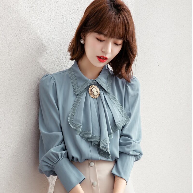 ブラウス シャツ ブローチ付き レトロスタイル レトロデザイン 今風 人形襟 シフォン 長袖 シャツ女性 フレンチコート 人気スタイル トップス シック レトロシャツ アプリコット ブルー 杏色 青 海外デザイン インポートファッション おしゃれ かわいい 着回し 重ね着 モード系 お出かけ パーティー 二次会 飲み会 合コン 女子会 お呼ばれ 発表会 特別な日 ディナー 誕生日 同窓会 人気デザイン 韓国デザイン オルチャン モテ トレンド トレンディ プチプラ 大人きれい 綺麗目女子 映える おすすめ
