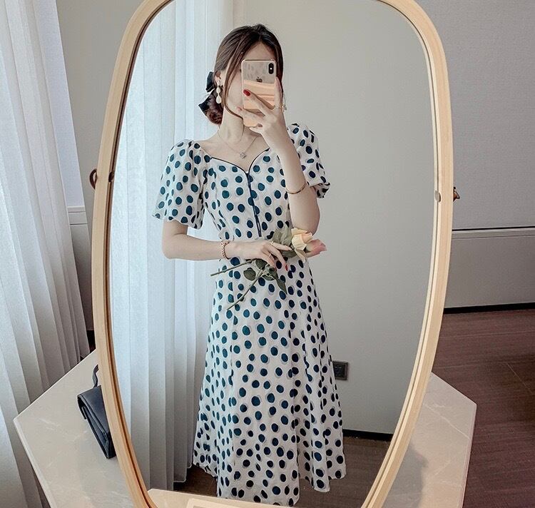ワンピース レディース ミドル丈 ドット柄 水玉 半袖 袖あり Aライン ハイウエスト ストリート シック プルオーバー お洒落 おしゃれ 可愛い かわいい フェミニン クール 大人 普段使い 大人可愛い 大人女子 おしゃれ ガーリー ラブリー キュート 抜け感 とろみ感 海外 インポート ネイビー 20代 30代 OL 通勤 S M L XL 休日 お呼ばれ パーティー イベント 旅行 韓国ファッション トレンド 韓国コーデ 簡単コーデ オルチャン メンズライク コーデ スタイル 韓国ファッション