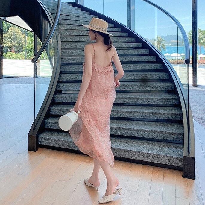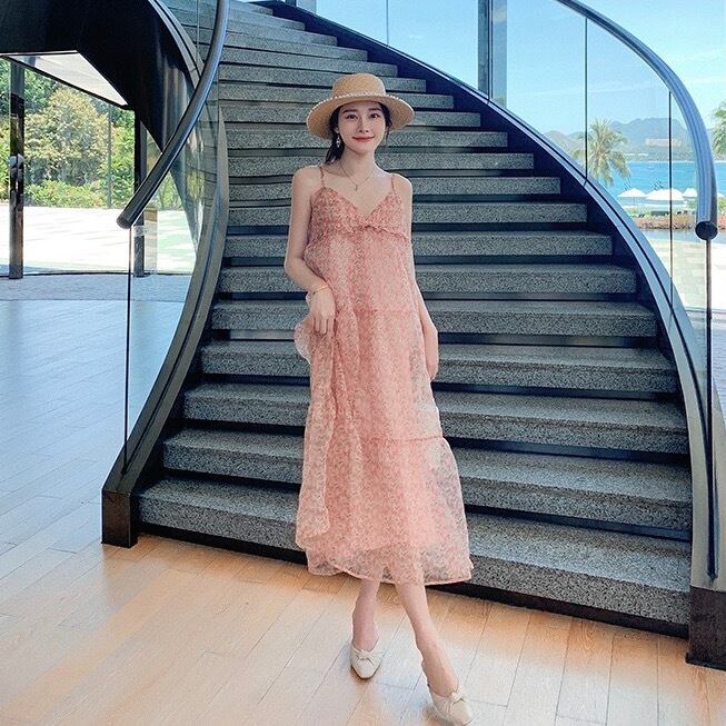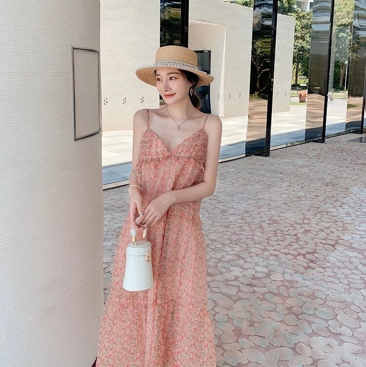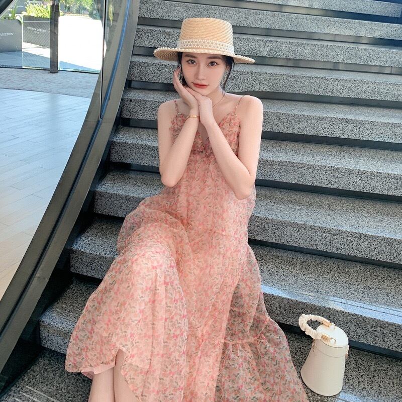 ワンピース レディース ミドル丈 シフォン ロングスカート ノースリーブ 袖なし オーガンジー サスペンダー ビーチドレス サマードレス プルオーバー Aライン Vネック ハイウエスト 花柄 お洒落 おしゃれ 可愛い かわいい フェミニン クール 大人 普段使い 大人可愛い 大人女子 おしゃれ ガーリー ラブリー キュート セクシー ゆるふわ ラフ ルーズ 抜け感 とろみ感 海外 インポート ピンク 10代 20代 S M L XL 休日 リゾート 海 旅行 韓国ファッション トレンド コーデ オルチャン