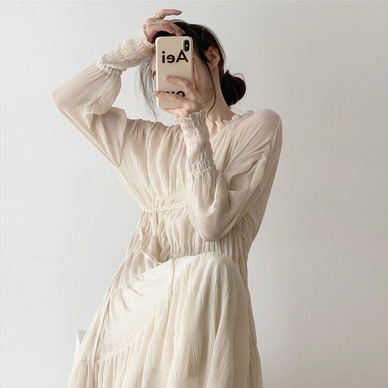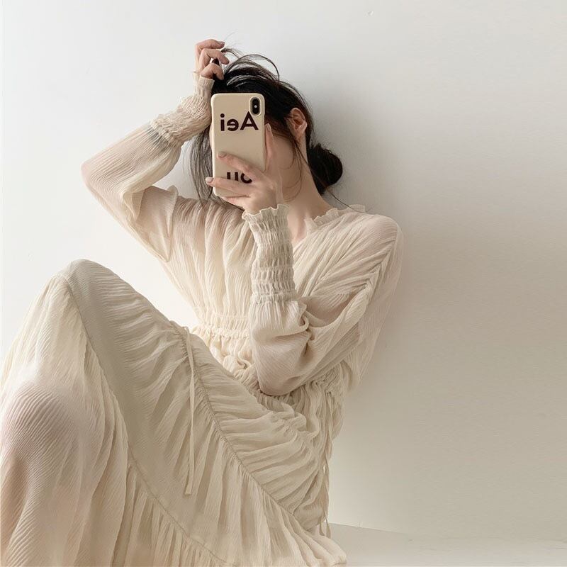 ワンピース レディース ロング丈 シフォン ロングスカート 長袖 袖あり プリーツスカート Vネック レース プルオーバー Aライン ハイウエスト インナー付き 2点セット 無地 お洒落 おしゃれ 可愛い かわいい フェミニン クール 大人 普段使い 大人可愛い 大人女子 おしゃれ ガーリー ラブリー キュート セクシー ゆるふわ ラフ ルーズ 抜け感 とろみ感 海外 インポート ベージュ 10代 20代 S M L XL 休日 リゾート 海 お出かけ 旅行 韓国ファッション トレンド コーデ オルチャン