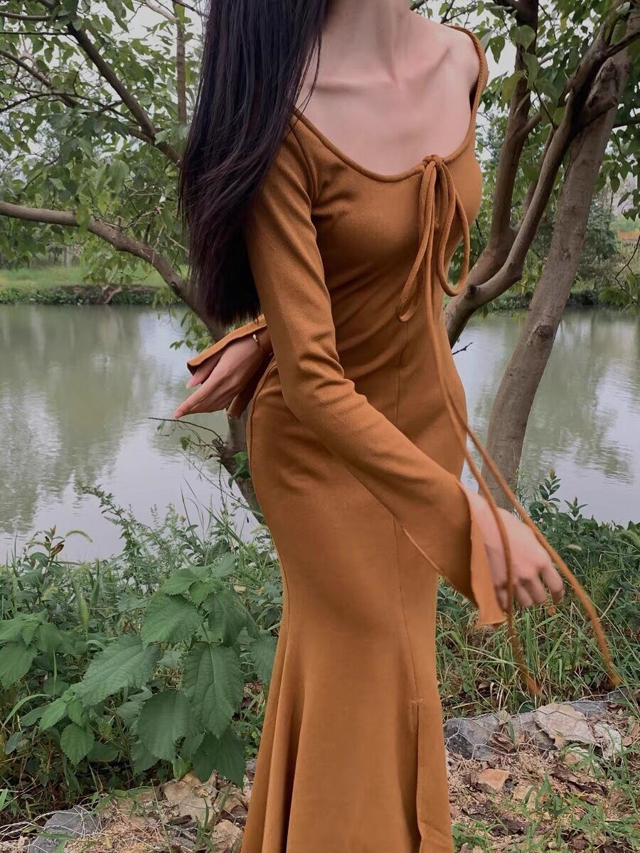 ワンピース レディース バックレス フィッシュテール ストラップ 新作 人気 ロング丈 ロングスカート 長袖 フリルスカート リボン レース ラウンドネック プルオーバー ハイウエスト スリット サイドスリット 無地 シンプル 春 レトロ お洒落 おしゃれ 可愛い かわいい フェミニン クール 大人 普段使い 大人可愛い 大人女子 おしゃれ セクシー スリム 細身 抜け感 とろみ感 海外 インポート ブラウン 茶色 20代 30代 S M L イベント リゾート 海 旅行 韓国ファッション オルチャン