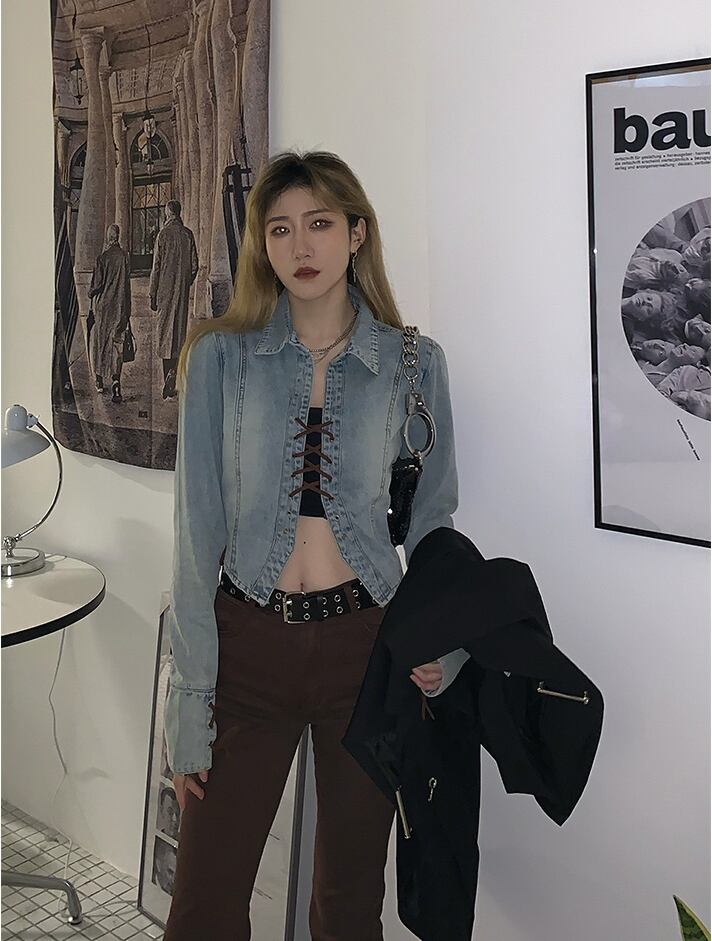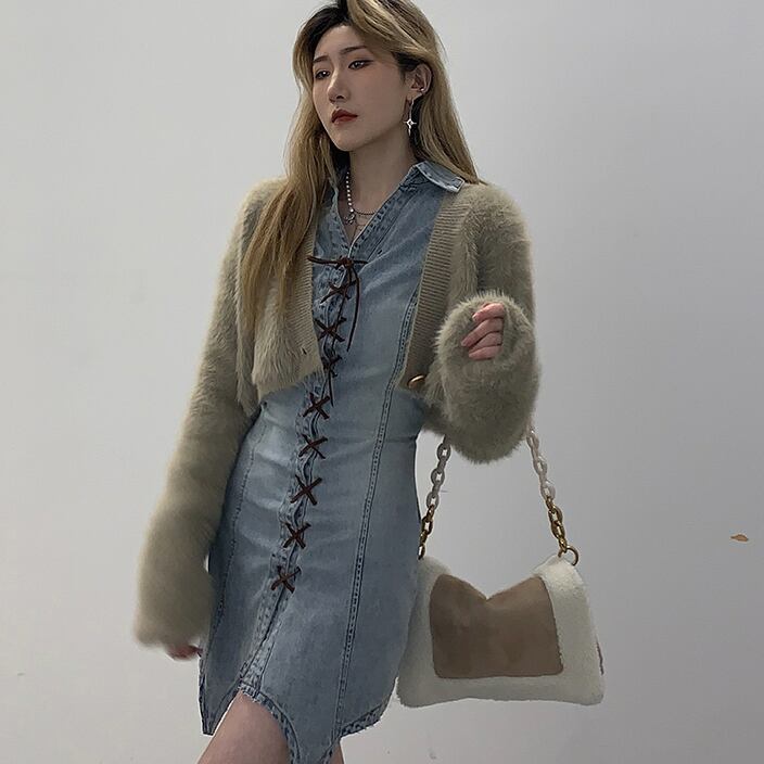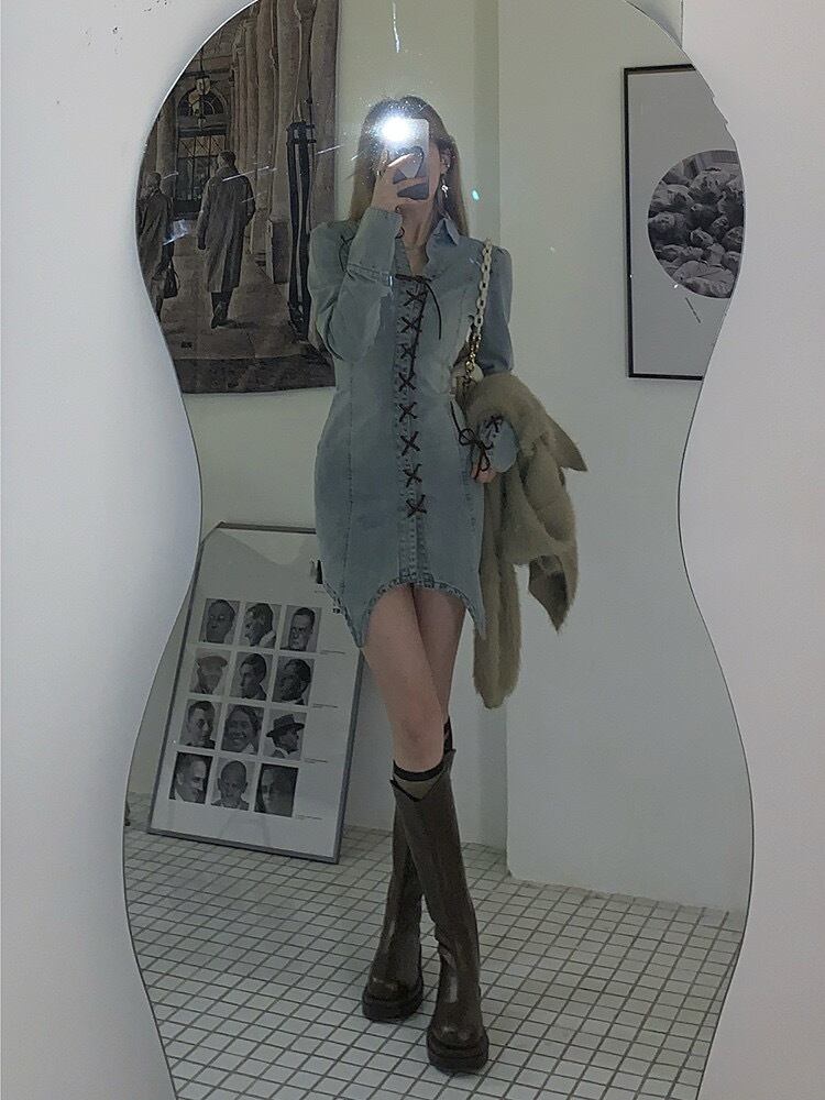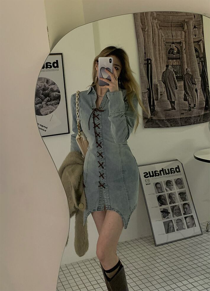 ワンピース レディース ショート丈 デニムスカート デニム 長袖 袖あり レースアップ ハイウエスト リボン 襟付き 前開き ストリート カジュアル 2way 冬 レトロ お洒落 おしゃれ 可愛い かわいい フェミニン クール 大人 普段使い 大人可愛い 大人女子 おしゃれ セクシー キュート ラブリー スリム 細身 抜け感 とろみ感 海外 インポート デニムブルー 青 10代 20代 S M L イベント お出かけ 旅行 休日 女子会 韓国ファッション オルチャン 人気 トレンド 脚長 美脚 簡単コーデ