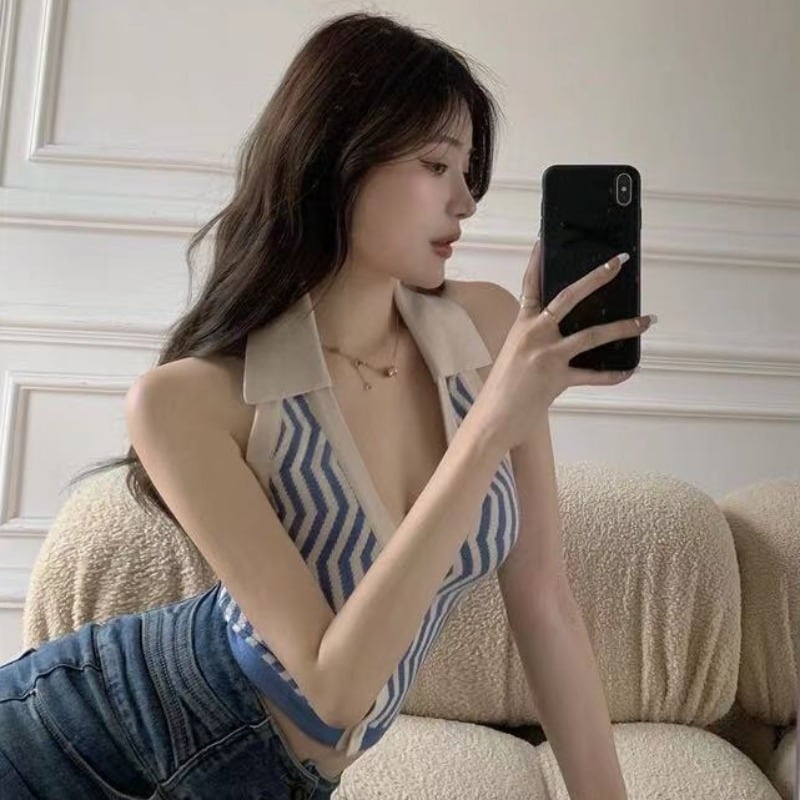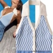 レディース ニット ホルターネック 前開き フロントボタン 襟付き 袖なし おしゃれ こなれ感 Vネック ブルーストライプ 柄 バックオープン 深め襟 サマーニット 白襟 バックシャン セクシー 大人っぽい 綺麗め ジグザグ ストライプ 大人女子 リゾート 旅行 イベント フェス 夏 ビーチ プール デート 海 海辺 爽やか 涼し気 かっこかわいい クールフェミニン 背中オープン カジュアル リラックスモード ラフ インポート プチプラ 韓国ファッション オルチャン 10代 20代 簡単コーデ 大人コーデ