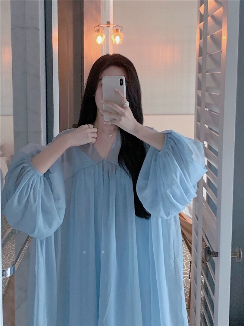 ワンピース ドレス レディース 女性用 長袖 ロング丈 フリル シースルー レース Vネック 薄手 Aラインスカート フレア ハイウエスト インナー バルーン袖 フレア袖 レトロ 大人可愛い カジュアル 大人カジュアル かわいい ガーリー おしゃれ かっこいい 大人女子 甘め メンズライク レディライク 単色 青 ブルー 桃 ピンク 春 秋 お出かけ デート 休日 リゾート 海辺 韓国ファッション トレンド OL 学生 10代 20代 30代 個性的 人気 シンプル ラフ こなれ感 ゆったり セクシー