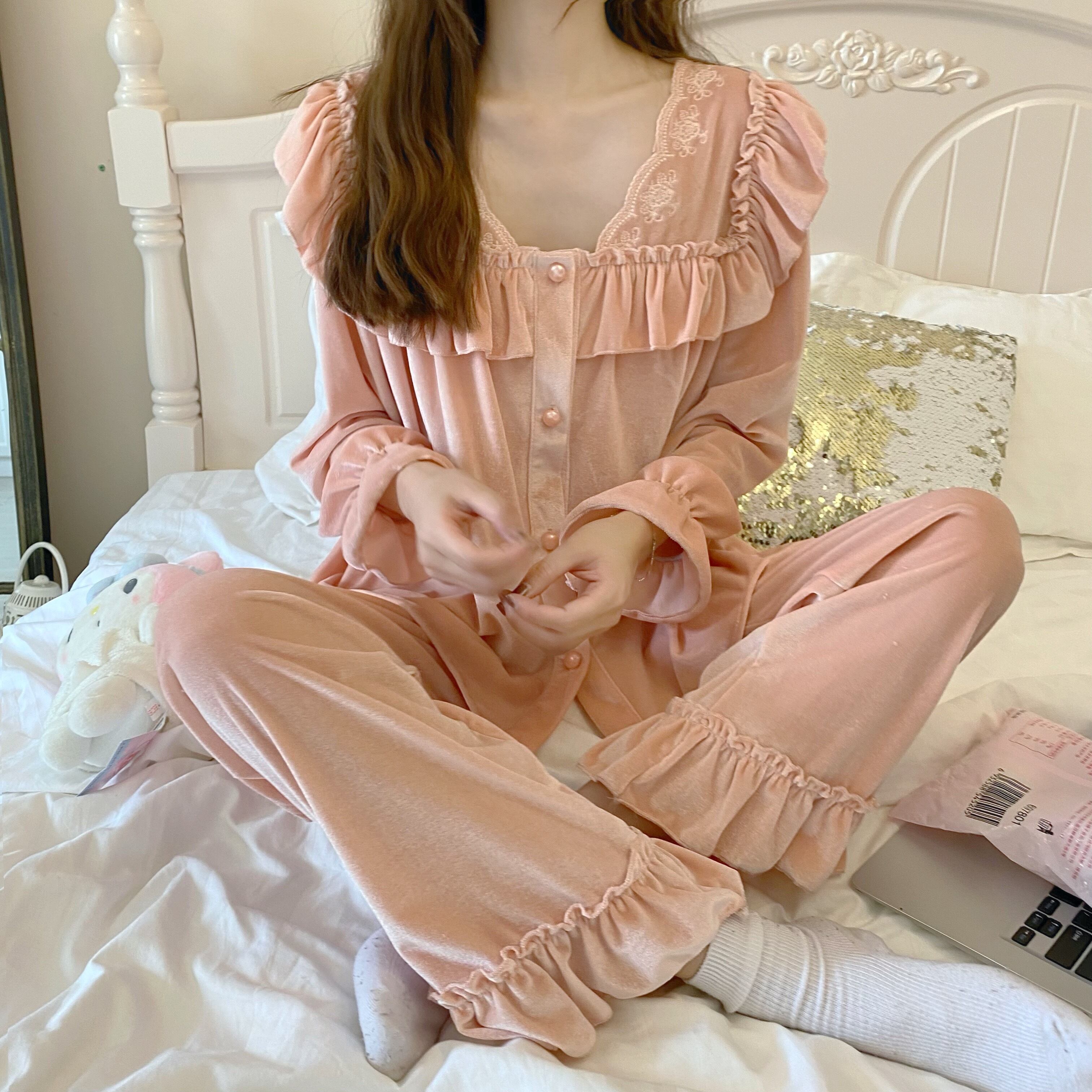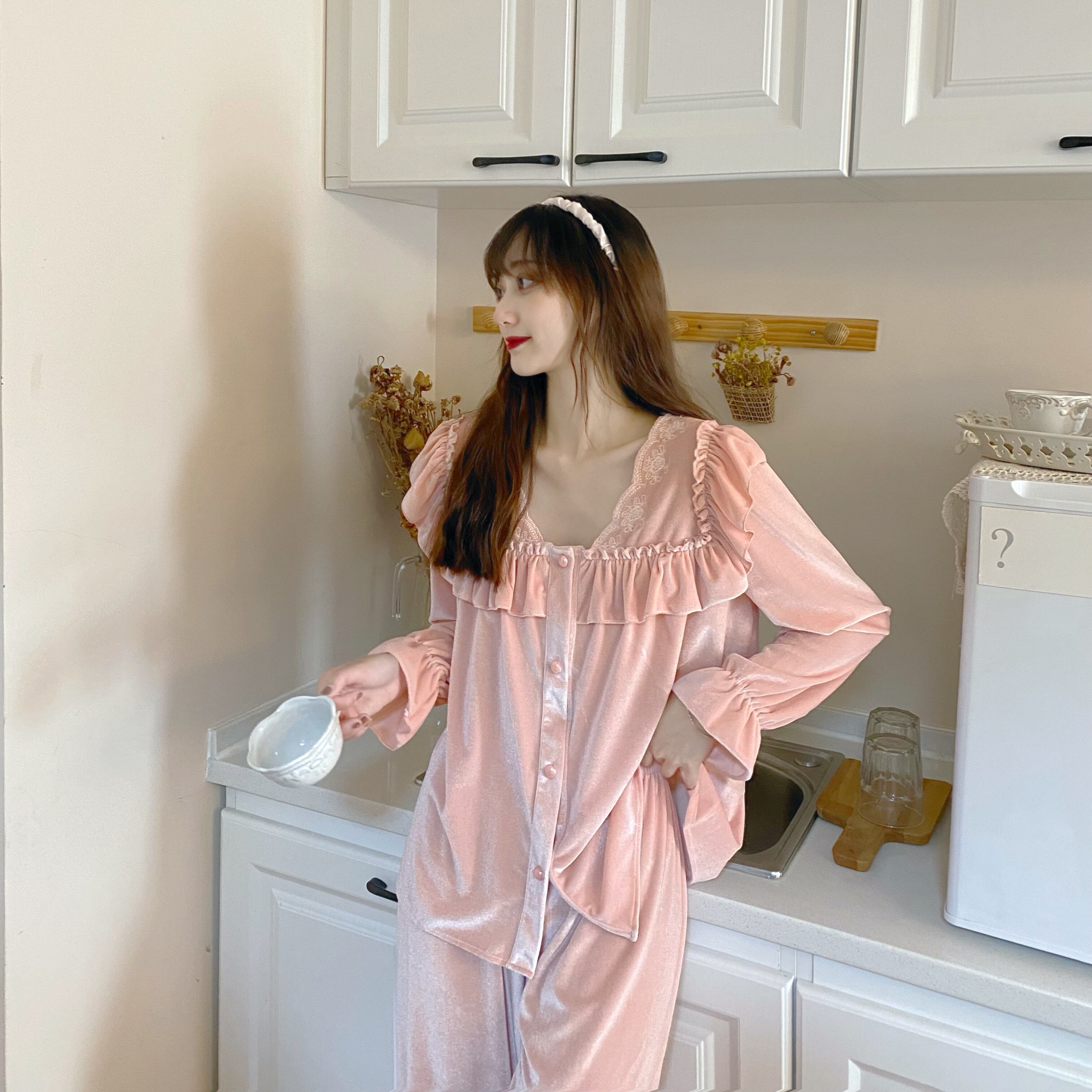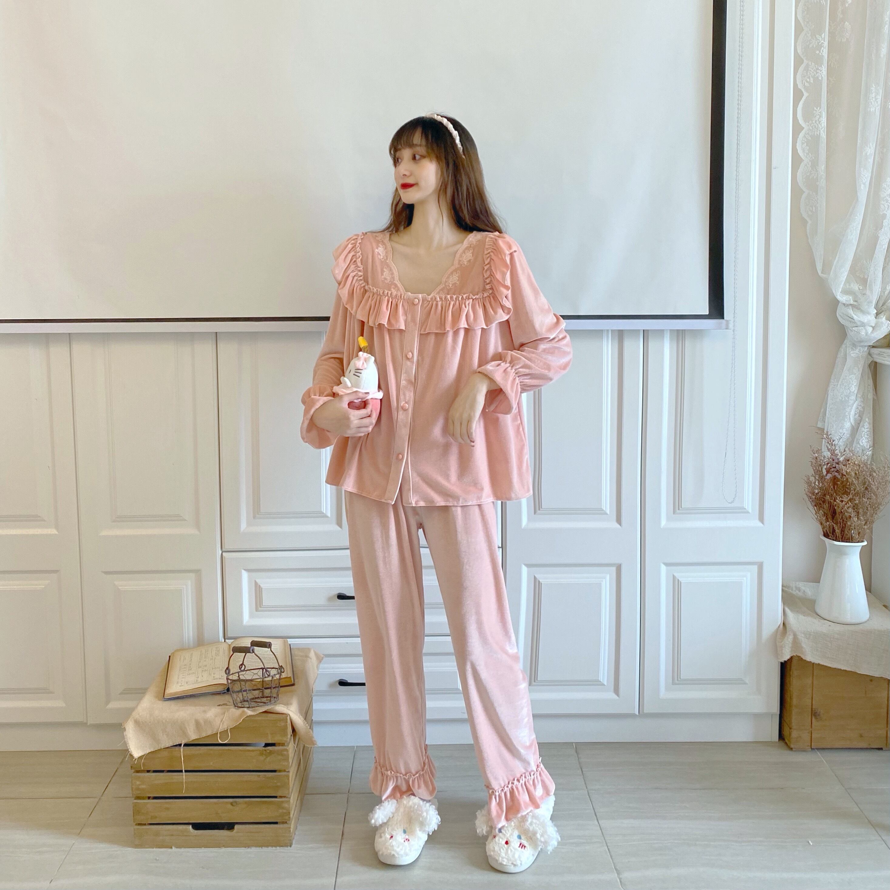 ルームウェア レディース パジャマ 部屋着 寝巻き ナイトウェア 上下セット 無地 長袖 袖あり 伸縮性 パンツ ボタン 前開き フリル ルーズ ゆったり ゆる ラフ 春 レトロ お洒落 おしゃれ 可愛い かわいい フェミニン 大人 普段使い 大人可愛い 大人女子 おしゃれ セクシー キュート ラブリー ゆるふわ 抜け感 とろみ感 海外 インポート ピンク 10代 20代 30代 ワンサイズ 旅行 休日 お泊まり 女子会 韓国ファッション オルチャン 人気 トレンド インスタ映え 楽ちん あったか 暖かい