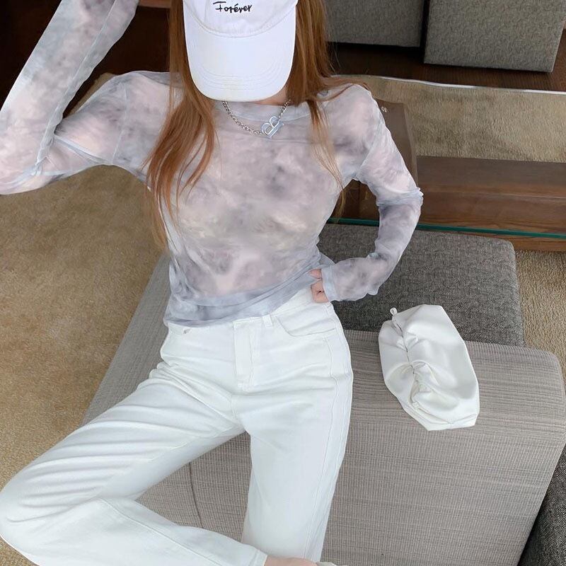 トップス レディース シャツ 長袖 袖あり タイダイ柄 タイダイ ラウンドネック スリムフィット スリム 細身 夏 サマー レトロ お洒落 おしゃれ 可愛い かわいい フェミニン クール 大人 普段使い 大人可愛い 大人女子 おしゃれ セクシー キュート ラブリー 抜け感 とろみ感 海外 インポート ブルー 青 グレー 灰色 10代 20代 ワンサイズ お出かけ お呼ばれ 旅行 休日 女子会 きれいめ デート カジュアル 韓国ファッション オルチャン 人気 トレンド 簡単コーデ 韓国 モテ 楽ちん