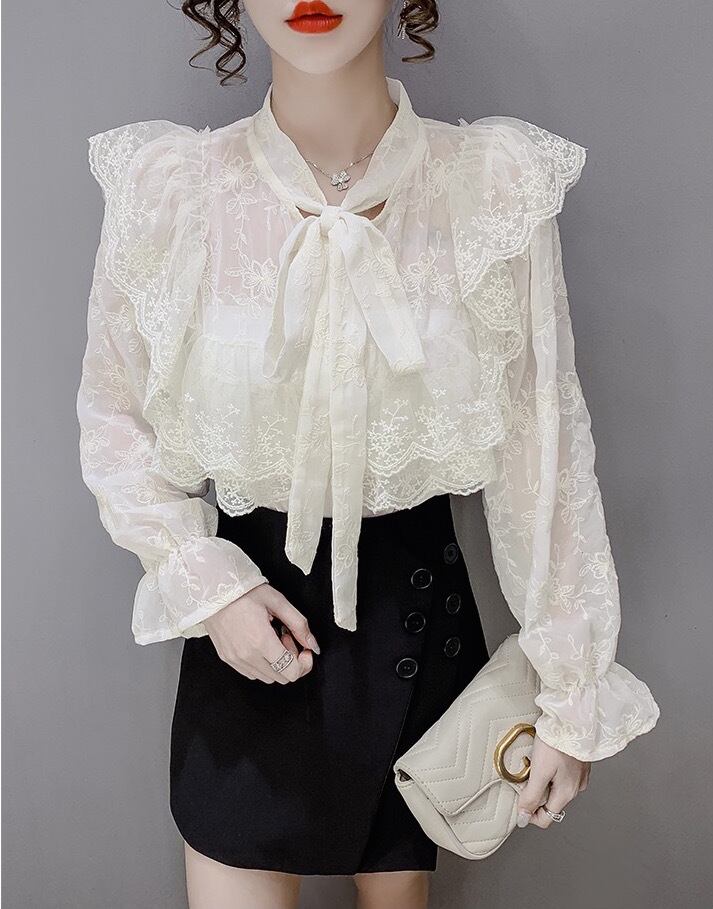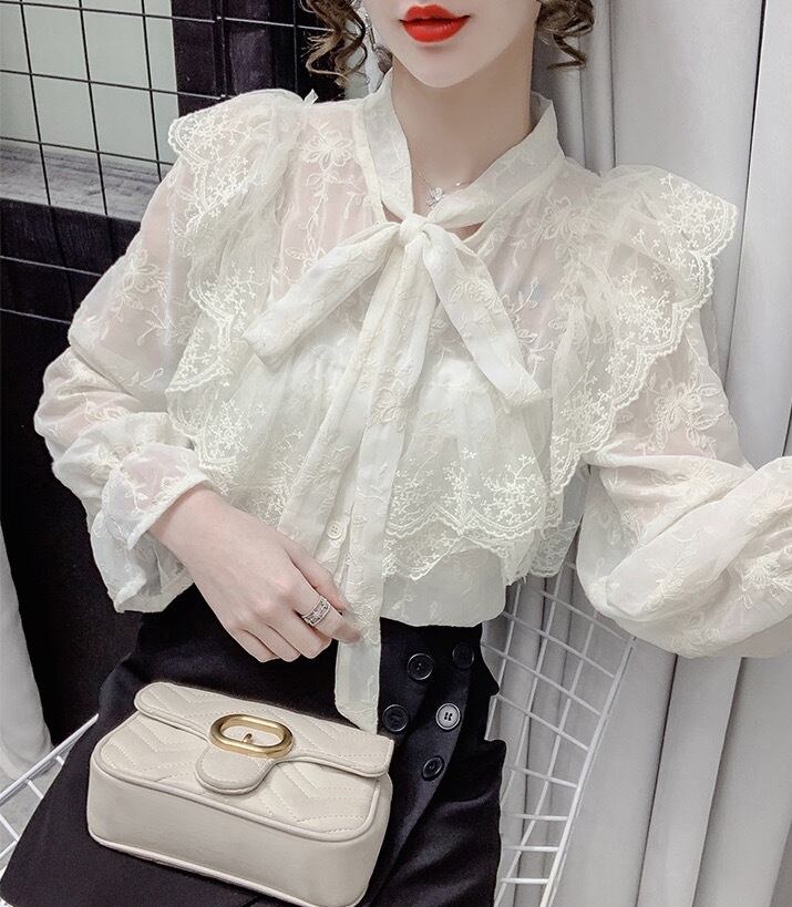 トップス レディース シャツ レースシャツ レース シフォン シフォンシャツ 長袖 新作 フレアスリーブ スタンドカラー リボン 透け感 ルーズ ゆるふわ 秋 冬 レトロ お洒落 おしゃれ 可愛い かわいい フェミニン クール 大人 普段使い シック 大人可愛い 大人女子 おしゃれ セクシー キュート ラブリー 抜け感 とろみ感 海外 インポート ホワイト 白 アプリコット 10代 20代 お呼ばれ フォーマル パーティー 女子会 きれいめ デート 韓国ファッション オルチャン 人気 トレンド