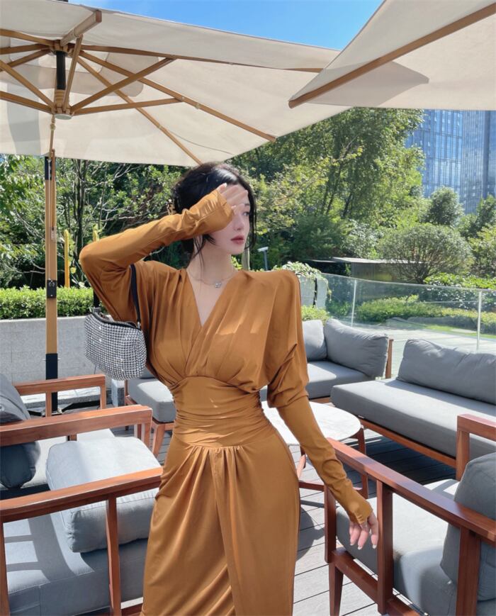 ワンピース レディース ドレスワンピ ボヘミアンドレス ロングスカート ロング丈 スリット 新作 長袖 Vネック 大人クール サイドスリット ギャザー 無地 黒 ブラック キャメル 茶色 かわいい 大人可愛い 大人 大人女子 きれいめ おしゃれ お洒落 シンプル ラブリー キュート ガーリー フェミニン 10代 20代 30代 学生 通学 デート お出かけ 女子会 普段使い こなれ感 抜け感 ゆったり 上品 エレガント 優雅 セクシー 豪華 ゴージャス インパクト 二次会 披露宴 パーティー イベント