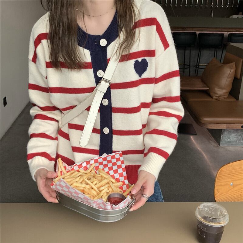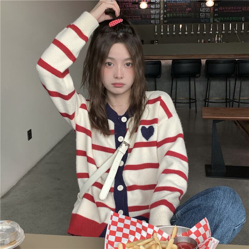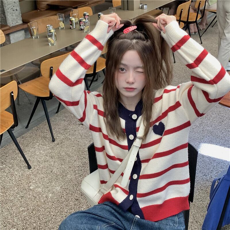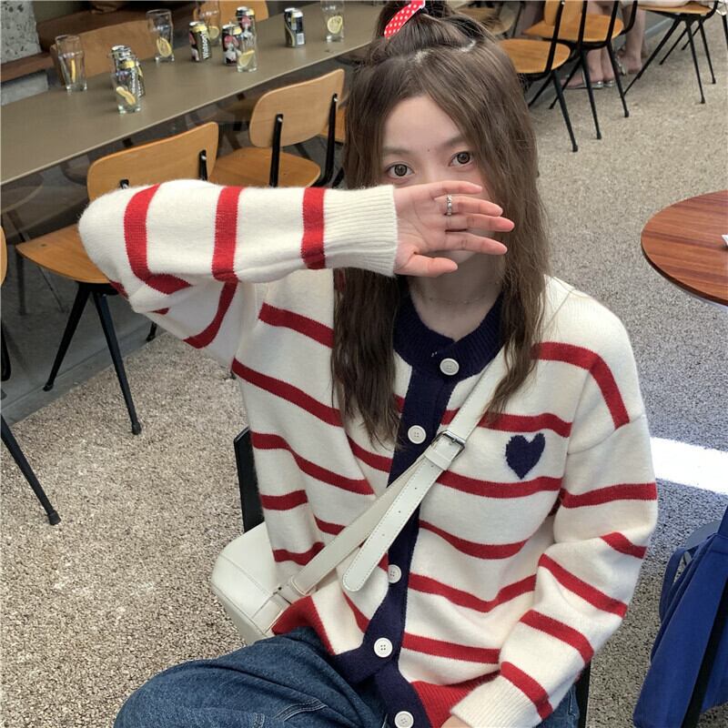 カーディガン レディース トップス 長袖 春秋 ボーダー ラウンドネック 前開き フロントボタン リブ袖 ドロップショルダー 大きめボタン ハートワンポイント 配色カーディガン カジュアル マリンテイスト 可愛い 学生 10代 20代 ハートマーク 柄カーディガン 赤 青 デート 休日 リラックス ショッピング 普段使い 幼稚園送迎 かわいい 韓国ファッション 韓国 インポート服 着まわせる 低価格 お買い得 サイズ豊富 ゆったりサイズ ゆるコーデ 柔らか素材 爽やか L XL 2XL 3XL 4XL