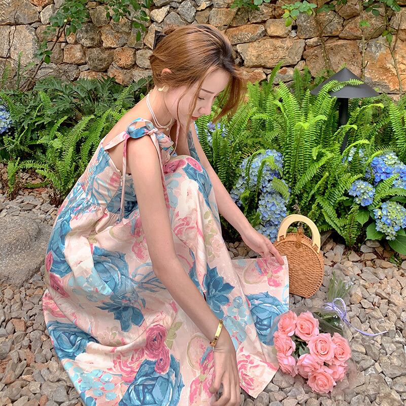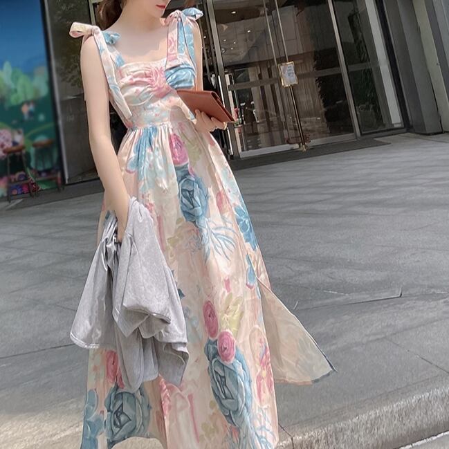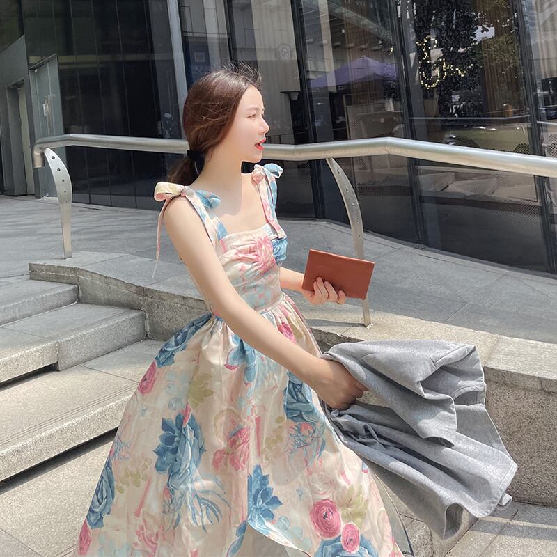 パーティードレス ワンピースドレス エレガント ガッシュフラワー 花柄 フラワープリント リボン フレアースカート ボリューム 肩リボン ハイウエスト ビッグスイング チュチュスカート ストラップサスペンダースカート スプリットドレス 夏 サマーファッション 旅行 ビーチ プール レトロデザイン 今風 ファッショナブル 流行 トレンディ インポート プチプラ ランキング 大人かわいい ラブリー 普段使い カジュアル お呼ばれ プチプラ 映える インスタ映え 人気デザイン 大人クール 二次会 ウエディング